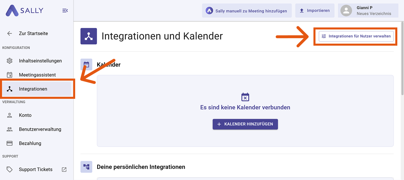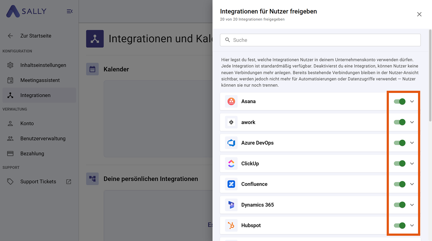 Integrationen für Nutzer in Sally AI freigeben und verwalten