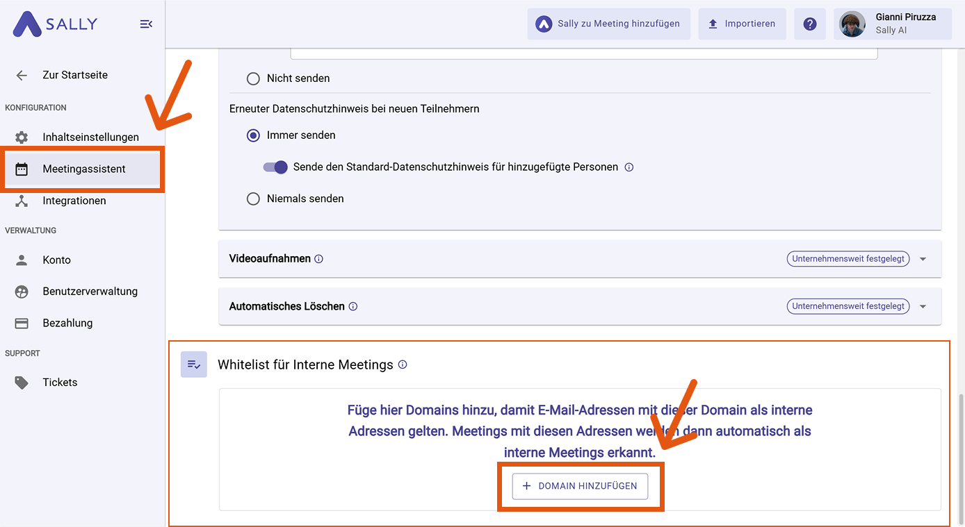 Sally unterscheidet zwischen internen und externen Teilnehmern anhand deiner Internen Domain-Whitelist. Diese wird von Einstellungen wie „Nur bei externen Meetings senden" in deinen Datenschutzhinweis-Einstellungen und Videoaufzeichnungs-Einstellungen verwendet.