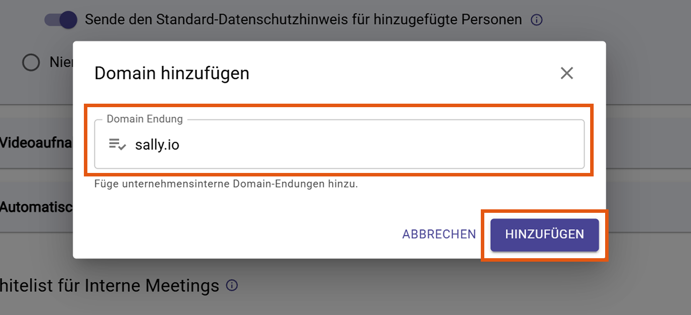 - Scrolle zum Abschnitt „Whitelist für interne Meetings" und klicke auf „+ Domain hinzufügen".