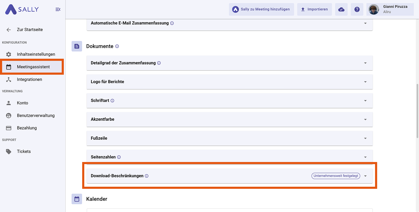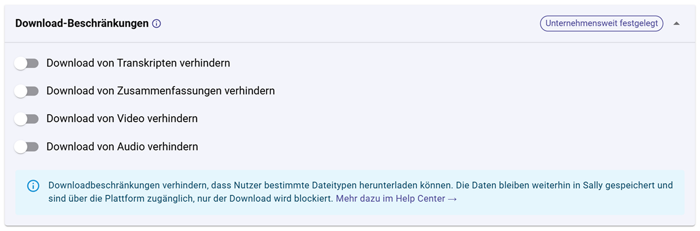 Durch Download-Beschränkungen kannst du verhindern, dass Nutzer Transkripte, Zusammenfassungen, Videoaufzeichnungen oder Audioaufnahmen exportieren – sie können diese Inhalte jedoch weiterhin in Sally ansehen.