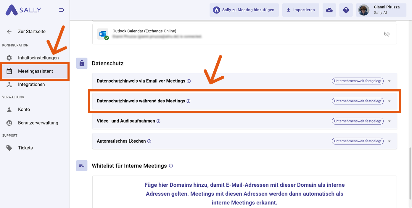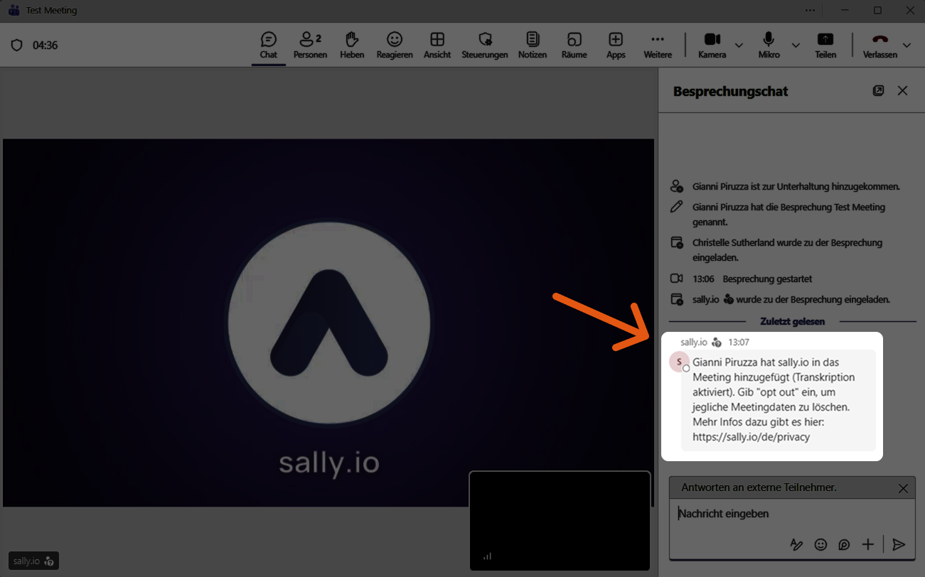 Der Datenschutzhinweis ist eine kurze Nachricht, die Teilnehmer über Sallys Teilnahme am Meeting und den Umgang mit ihren Daten informiert. Je nach Einstellung erscheint sie vor oder während des Meetings im Chat.