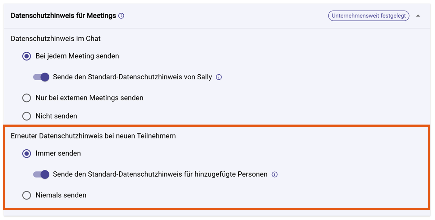 Lege fest, ob Sally einen erneuten Datenschutzhinweis senden soll, wenn neue Teilnehmer einem laufenden Meeting beitreten.