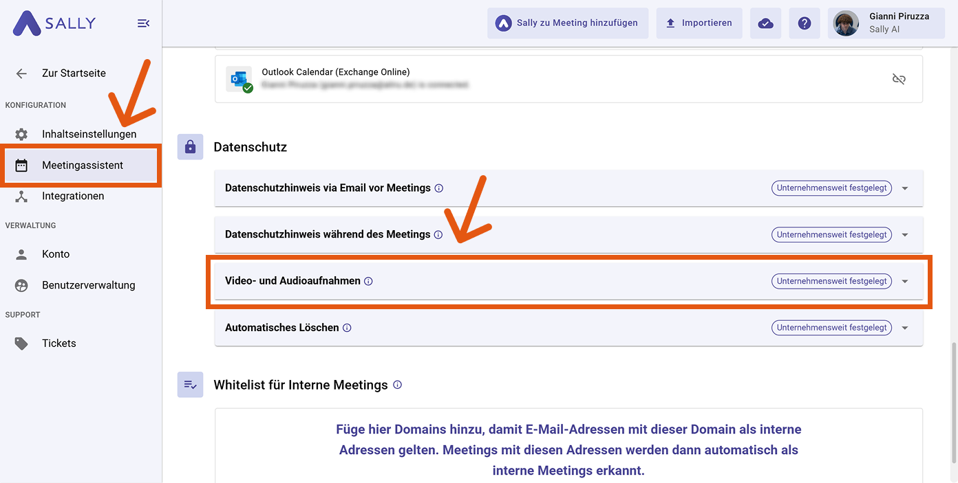 Lege fest, wann Sally Videoaufzeichnungen speichern darf und ob Audioaufzeichnungen weiterhin gespeichert werden sollen, wenn Video eingeschränkt ist.