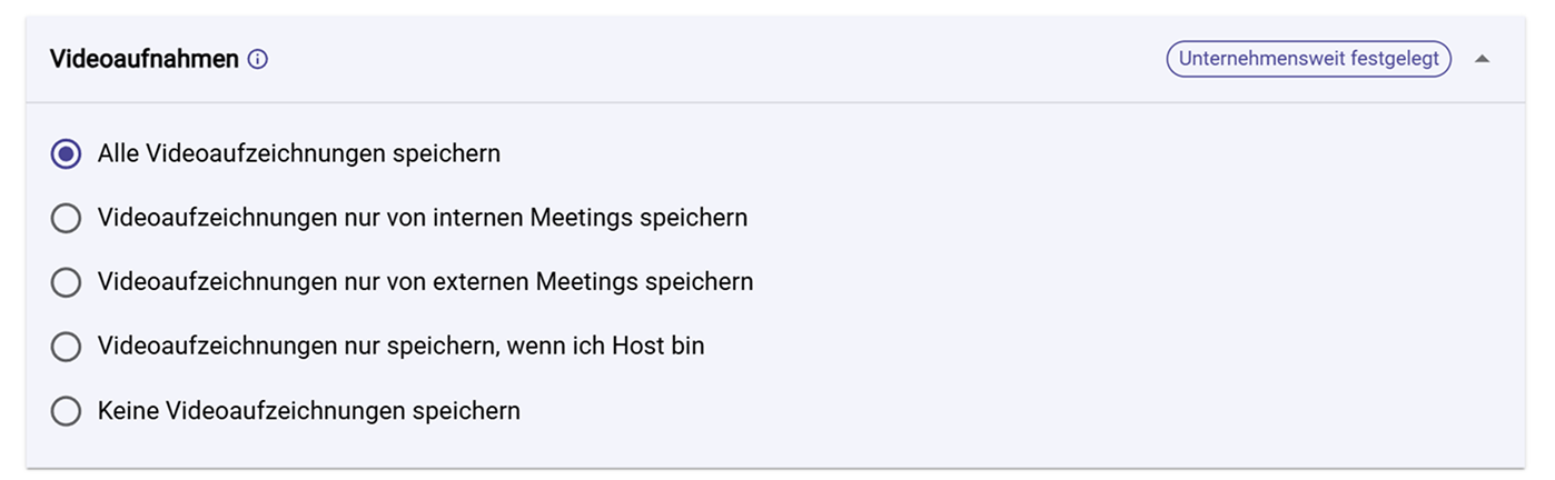 Nur Videoaufzeichnungen von internen Meetings speichern Nutzen, wenn: Externe Gespräche nicht standardmäßig aufgezeichnet werden sollen.