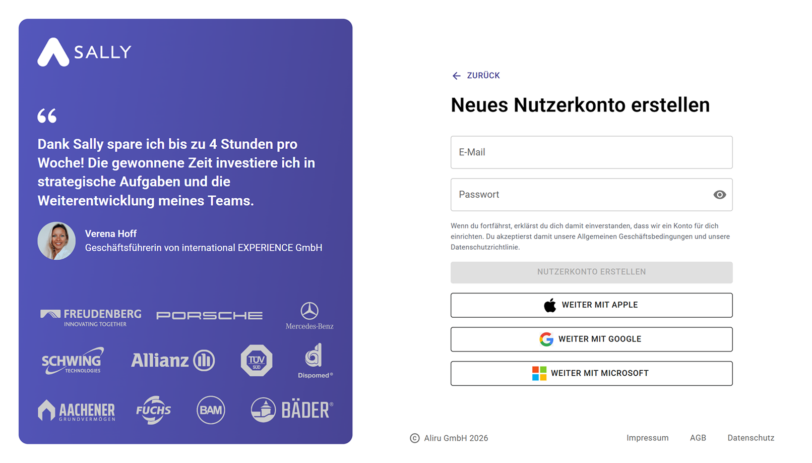 Um deine Meetings mit Sally transkribieren zu lassen, musst du dich zuerst registrieren und ein Sally-Konto erstellen.