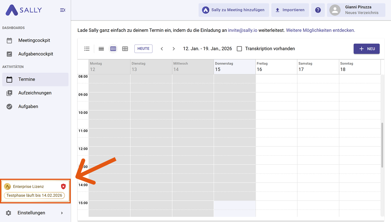 Du kannst Sally jetzt 30 Tage lang testen. Unten links siehst du, wie viel Zeit in deiner Testphase noch verbleibt.