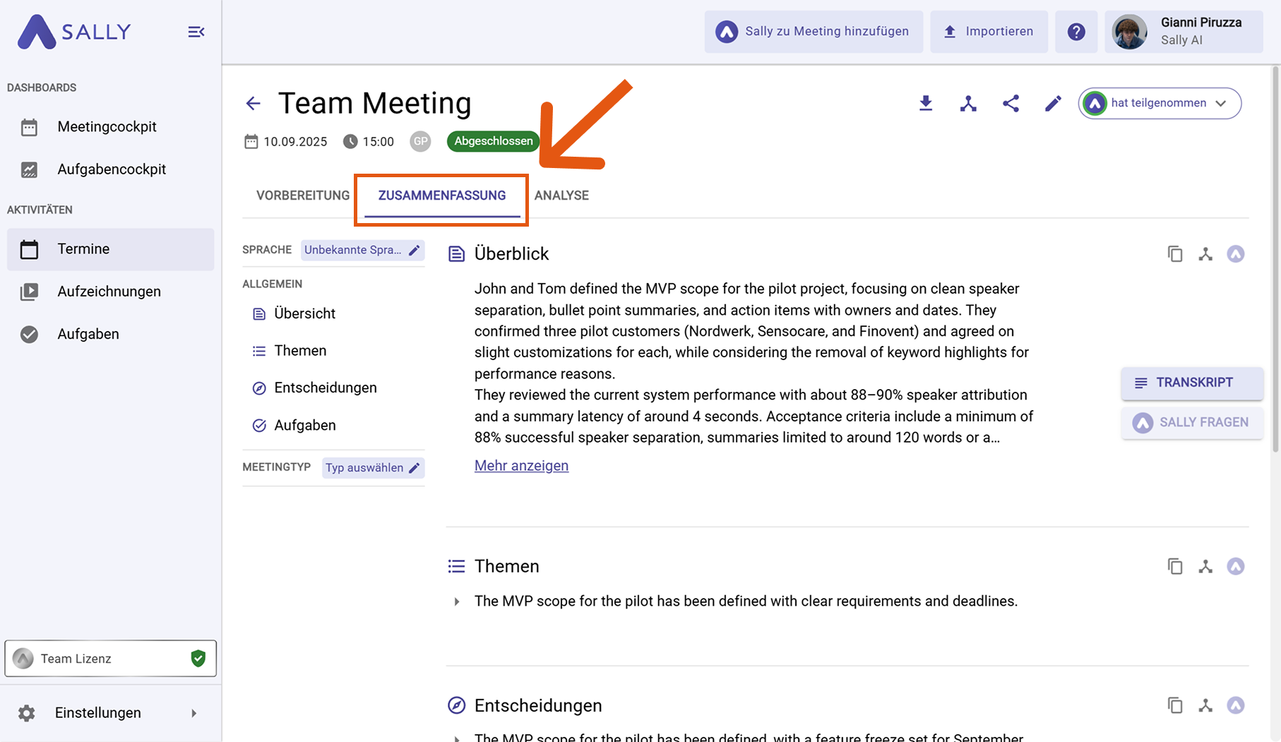 Nachdem Sally an deinem Meeting teilgenommen und es aufgezeichnet hat, wird automatisch eine strukturierte Zusammenfassung erstellt. So findest du sie.