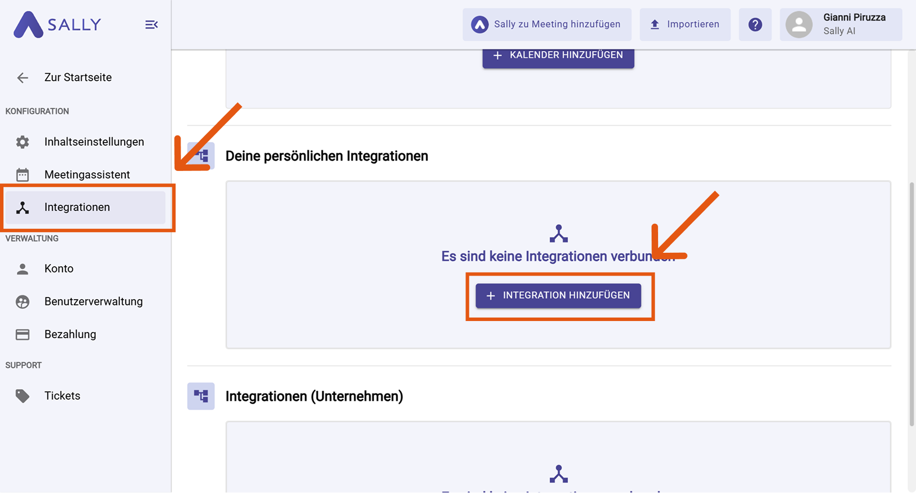 - Wähle anschließend im Menü Integrationen und klicke im Bereich Deine persönlichen Integrationen auf Integration hinzufügen.
