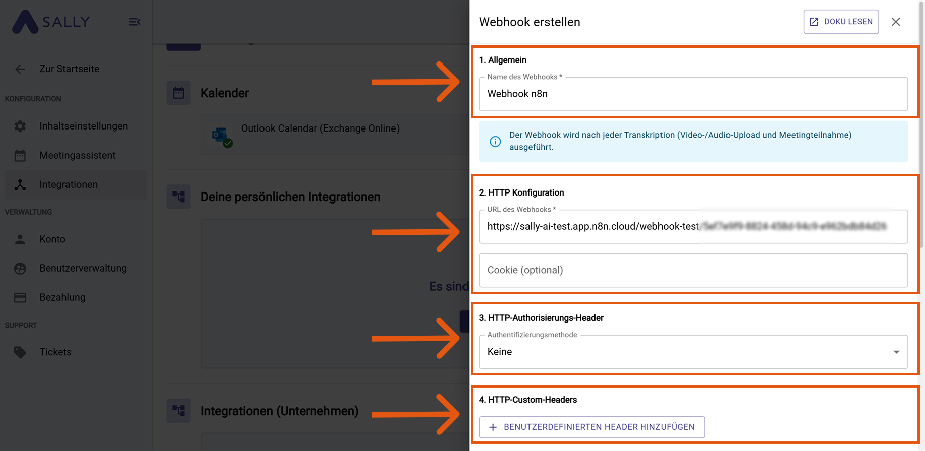 Immer wenn in Sally etwas Bestimmtes passiert – z. B. wenn eine Zusammenfassung erstellt wird – sendet Sally automatisch eine Nachricht an diese URL.