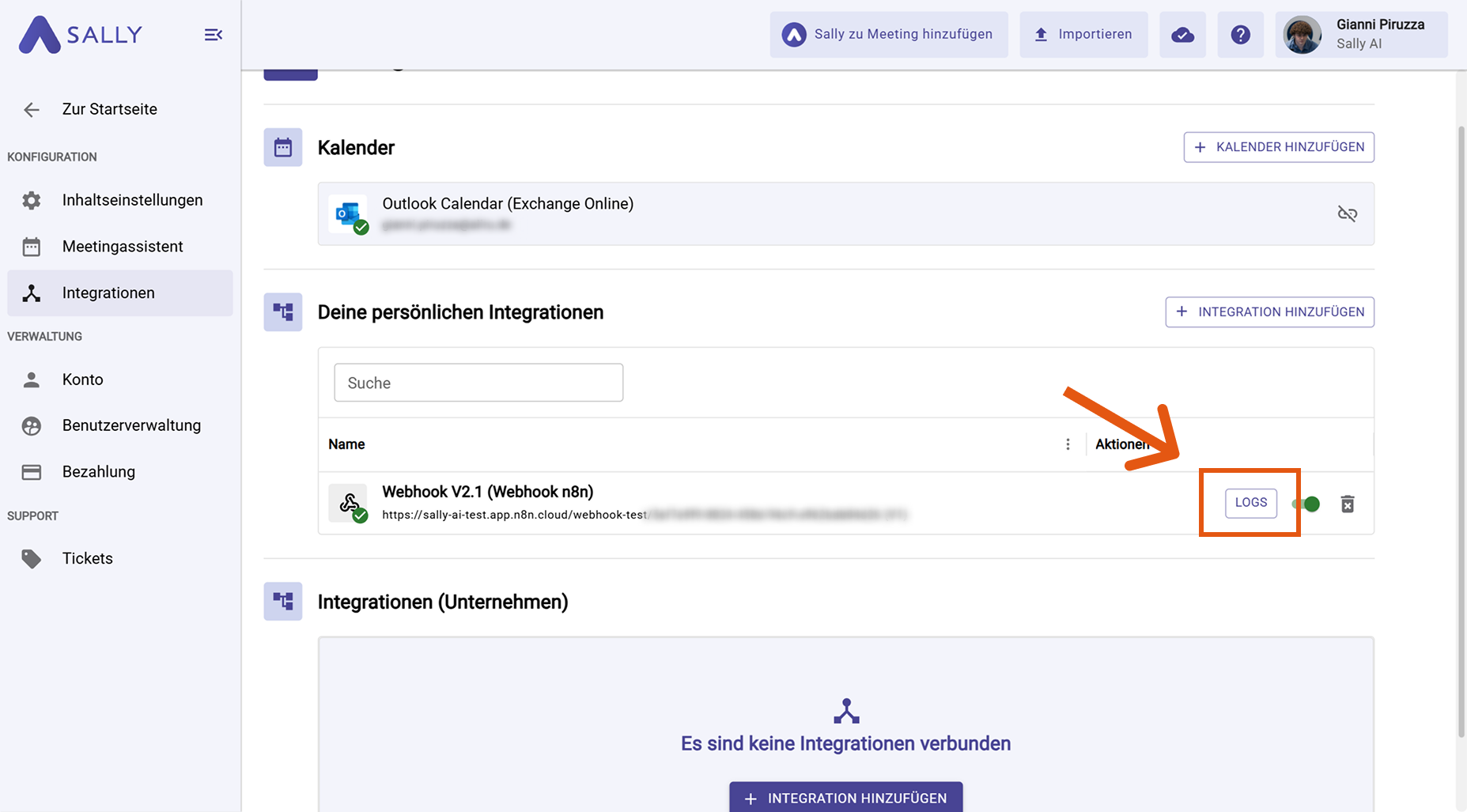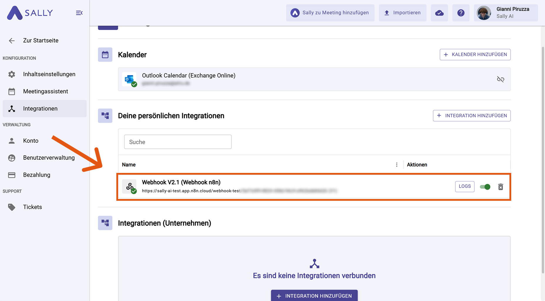 - Suche deinen Webhook unter Deine persönlichen Integrationen.