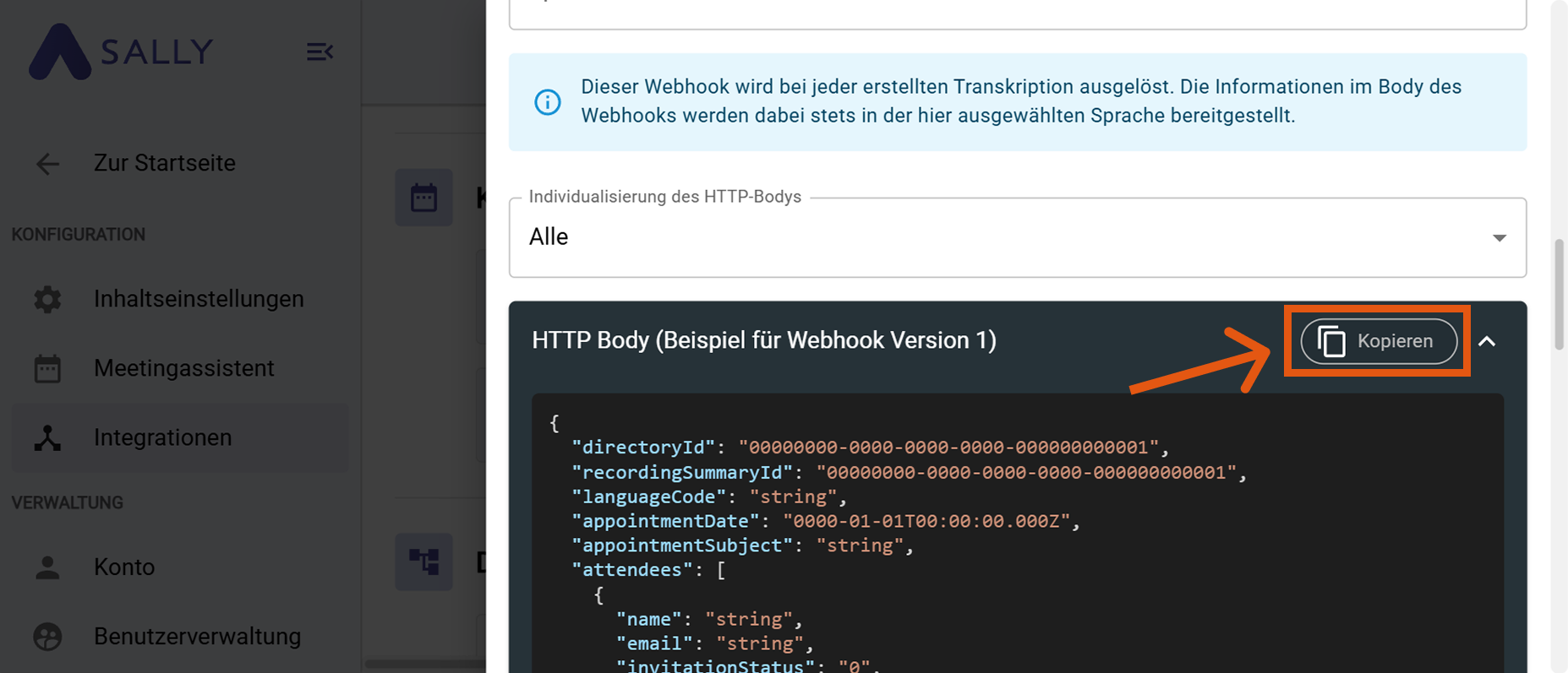 Während du deinen Webhook erstellst, zeigt dir Sally im Bereich „HTTP-Body“ automatisch ein vollständiges JSON-Beispiel an.