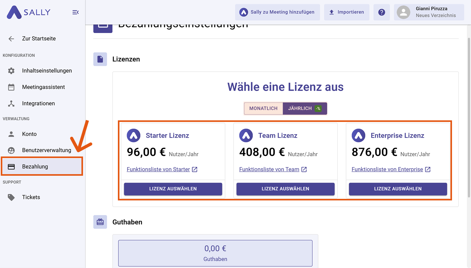 Während oder nach der Testphase kannst du deinen Zugang jederzeit aktivieren, um Sally ohne Einschränkungen zu nutzen.