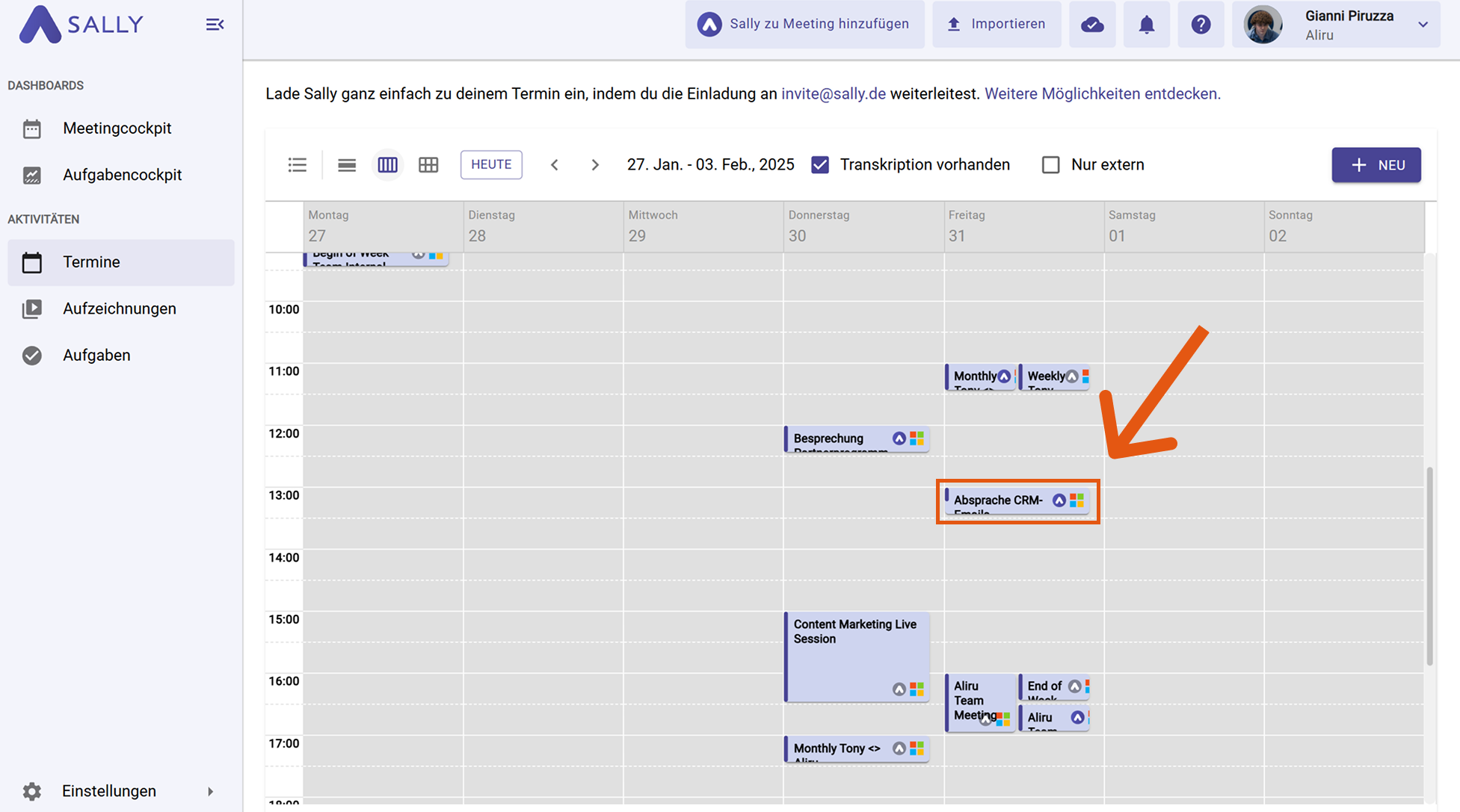Falls du das Transkript einer importierten Datei bearbeiten willst, kannst du dies im Tab Aufzeichnungen tun. So kannst du Änderungen direkt aus der Liste gespeicherter Aufzeichnungen vornehmen, ohne einen Termin zu öffnen.