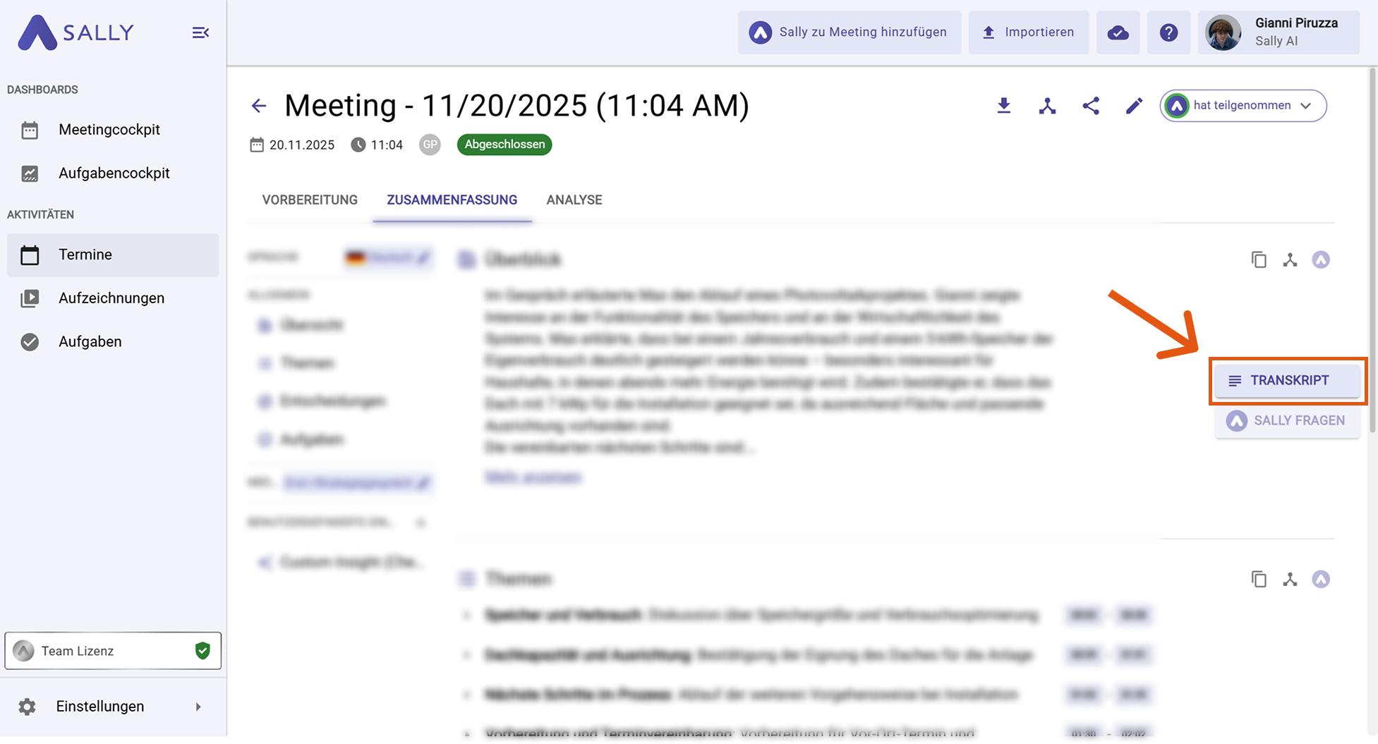 - Klicke auf der rechten Seite den Tab Transkript. Nun öffnet sich das Transkript.