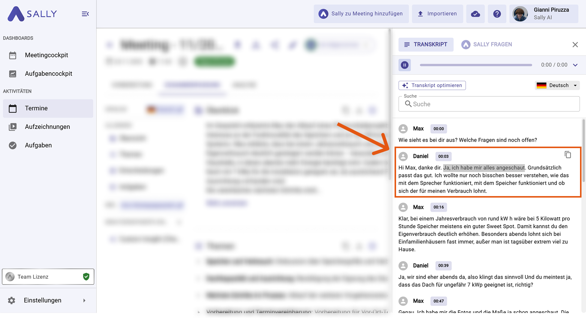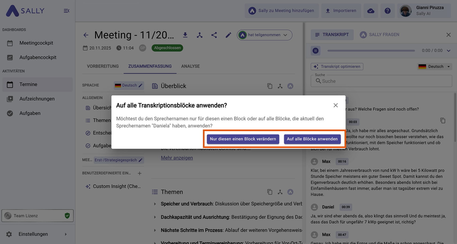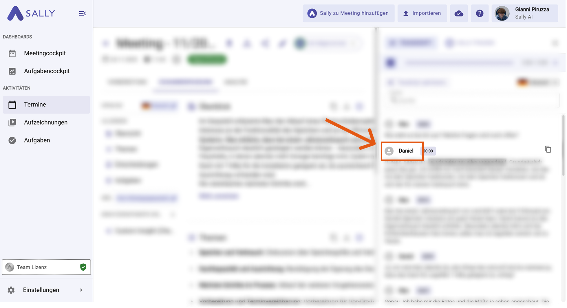 Wenn ein Satz durch schlechte Audioqualität oder sich überschneidende Redebeiträge dem falschen Sprecher zugeordnet wurde, kannst du den Namen manuell ändern.