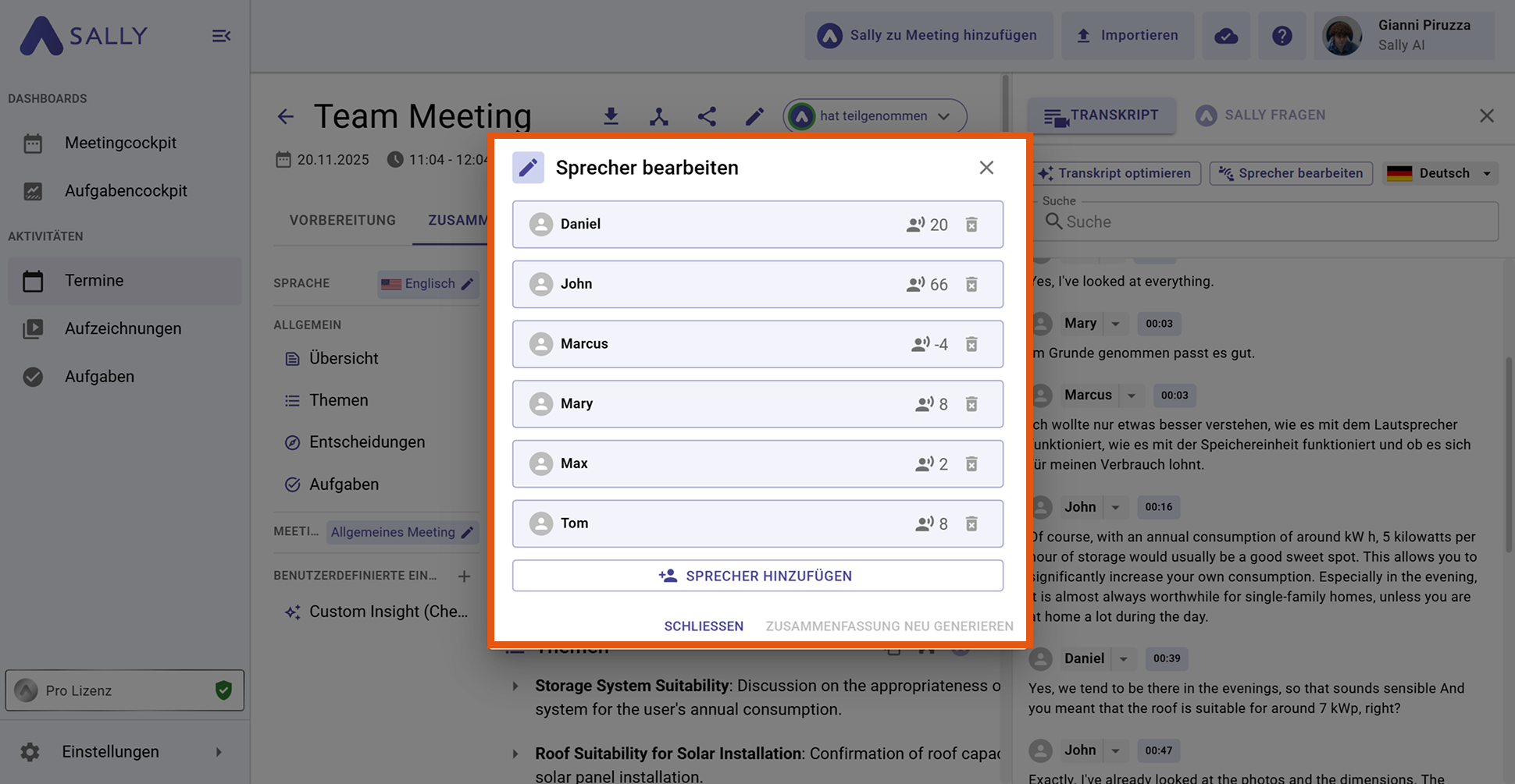 BeispielIn einem Meeting wurde ein einzelner Satz fälschlicherweise Anna zugeordnet, obwohl er von Tom stammt. Wenn du „Nur diesen einen Block verändern“ auswählst, wird nur dieser eine Satz auf Tom geändert. Alle anderen Stellen, an denen Anna korrekt spricht, bleiben unberührt.