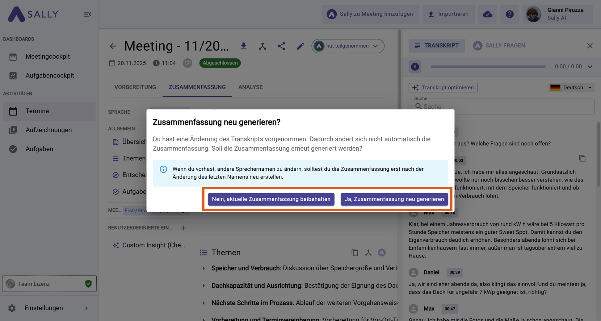 Danach wirst du gefragt, ob die Zusammenfassung mit den neuen Sprechernamen neu erstellt werden soll: