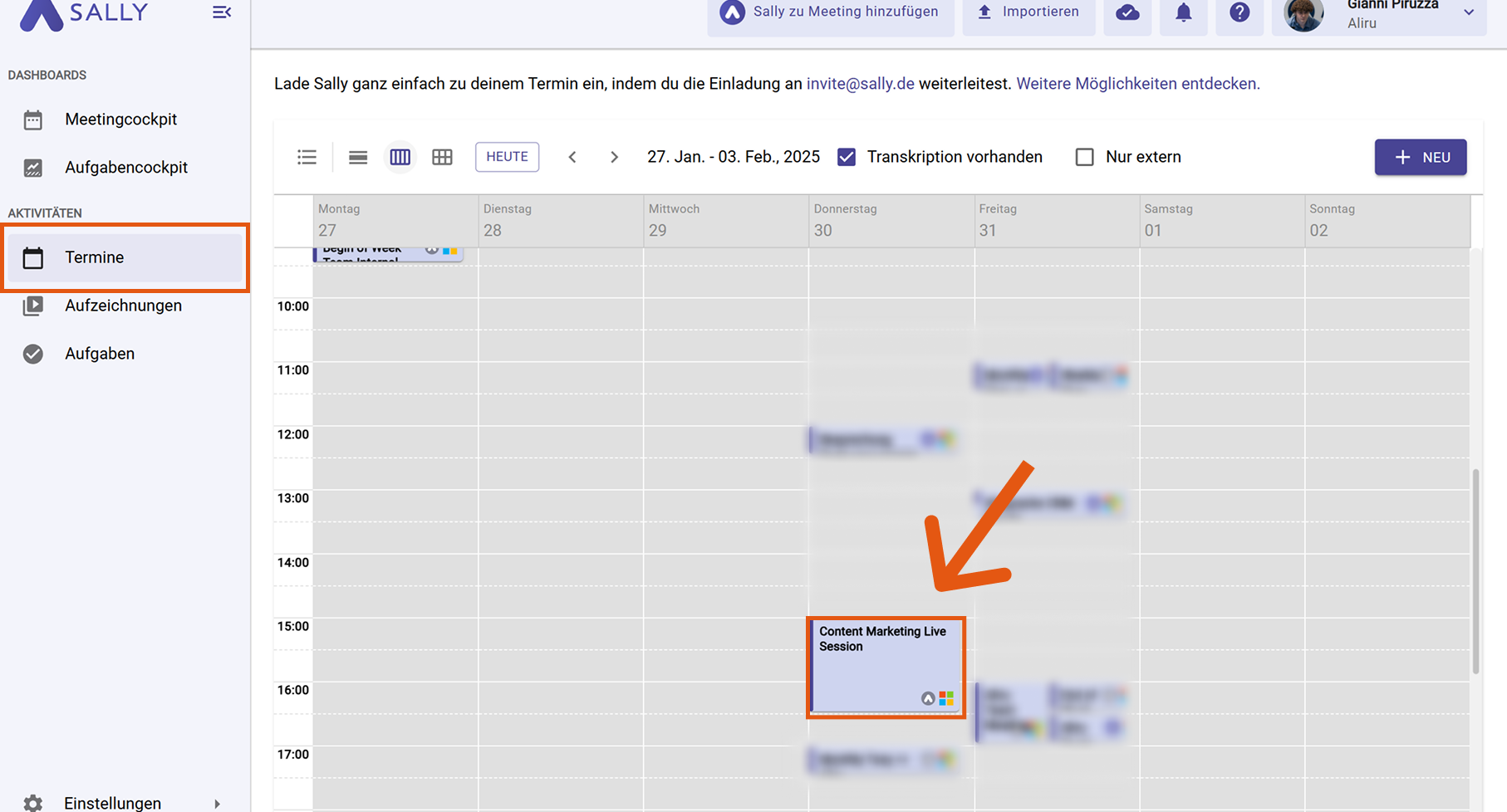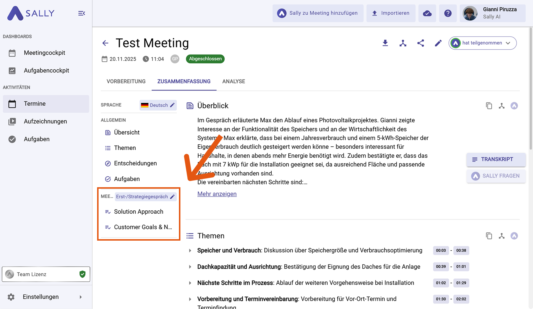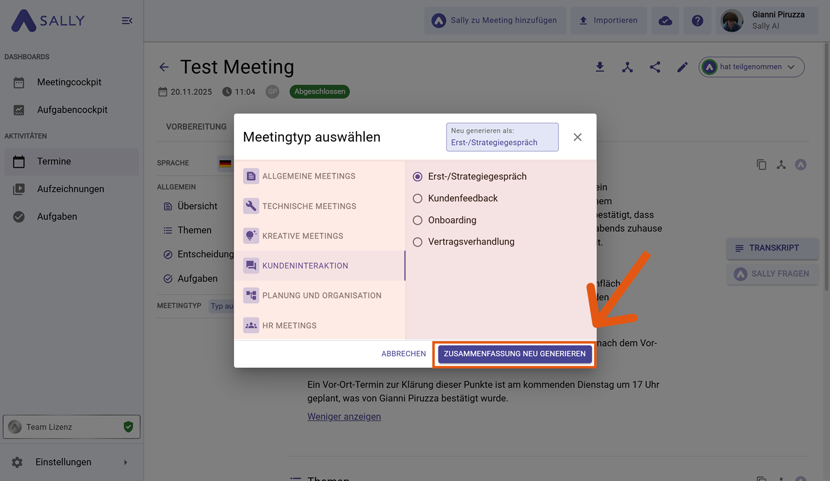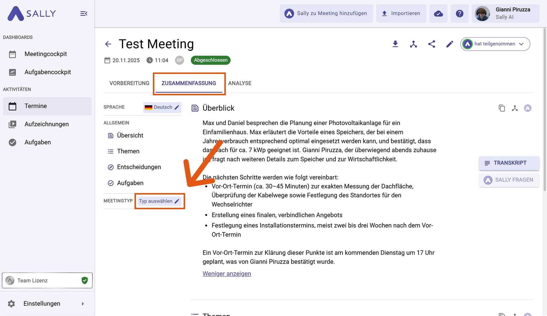 Wenn du den passenden Meetingtyp direkt im Voraus auswählst, sorgt Sally von Anfang an für die richtige Struktur – und du sparst dir später Zeit bei der Nachbearbeitung.