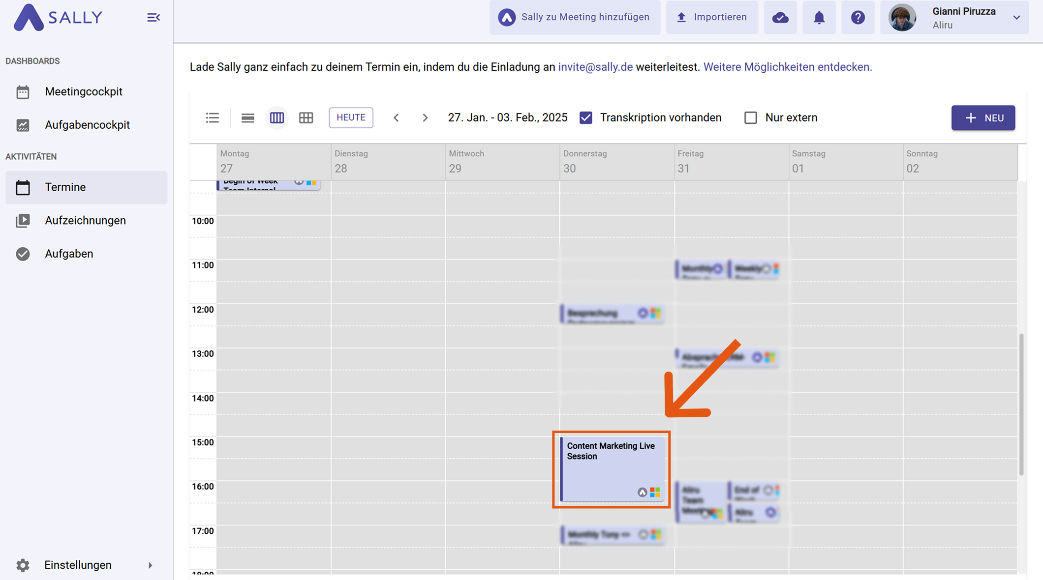 - Sally analysiert die Transkripte der passenden Meetings und zeigt: