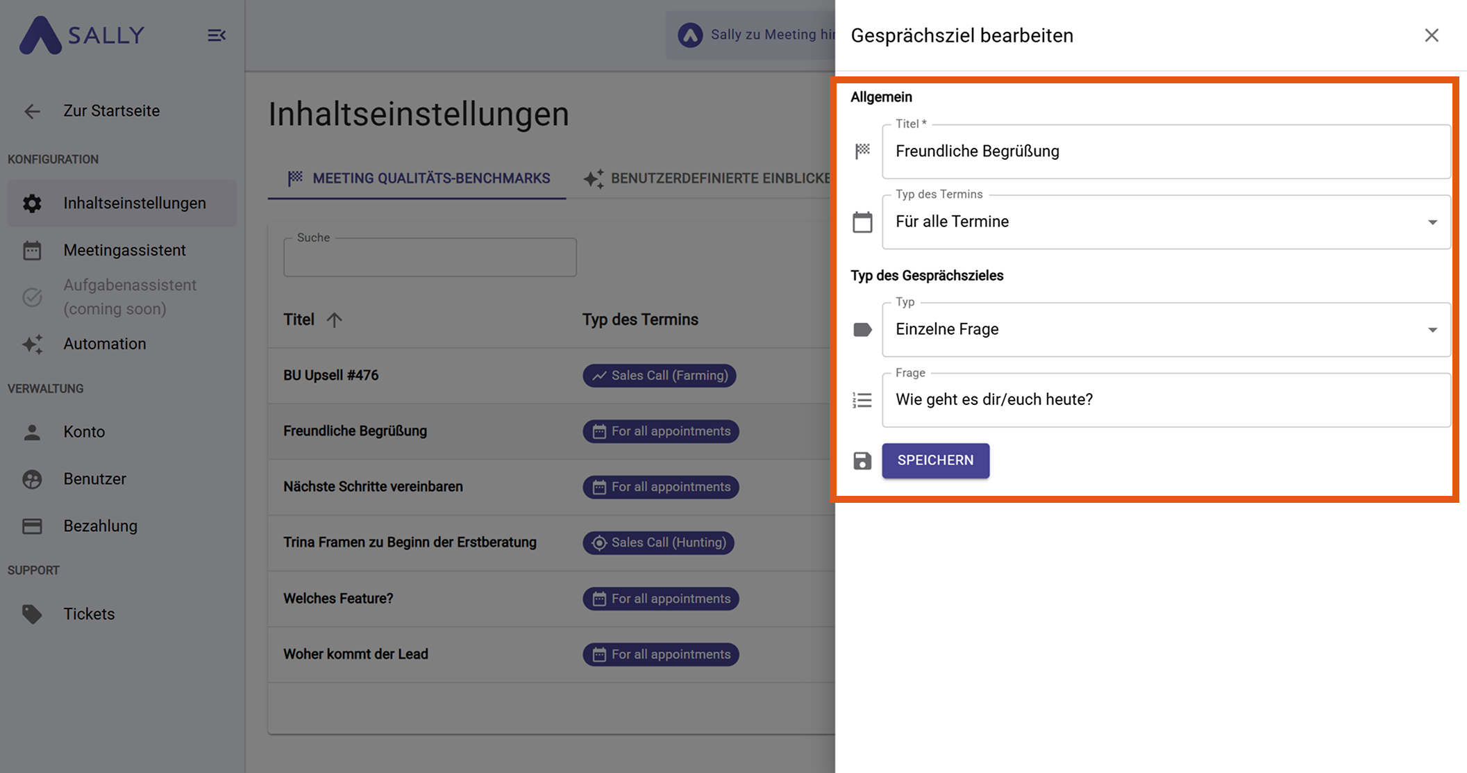 Du definierst eine konkrete Frage, die im Meeting vorkommen muss. Sally prüft, ob diese exakte Formulierung im Transkript erscheint.