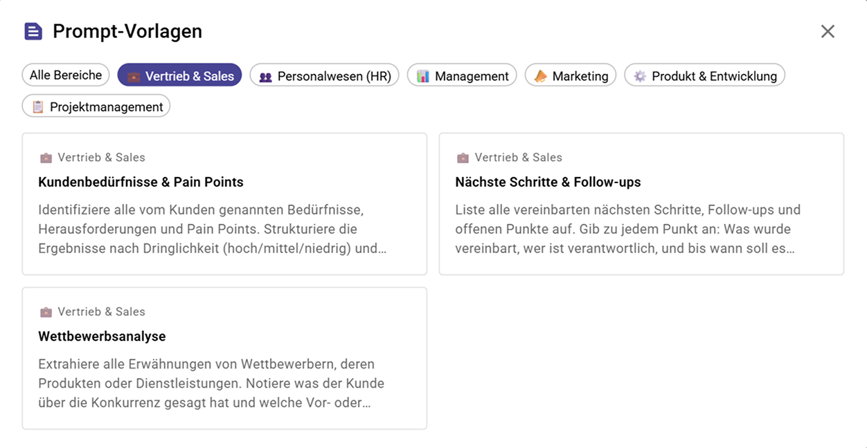 Ob du offene Aufgaben extrahieren, Entscheidungen zusammenfassen, Kundenfeedback erfassen oder Checklisten erstellen willst — es gibt eine Vorlage dafür.