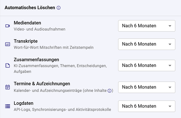 Lege individuelle Aufbewahrungsfristen für Transkripte, Audio & Video, Zusammenfassungen, Termine und Protokolldaten fest. Jeder Typ mit eigenem Zeitplan.