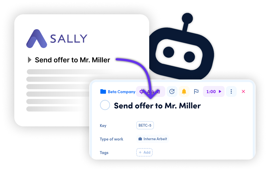 Verwandle Meeting-Einblicke aus Sally mit nur einem Klick in Aufgaben, Kommentare oder Zeiteinträge in awork – direkt aus der Zusammenfassung heraus.
