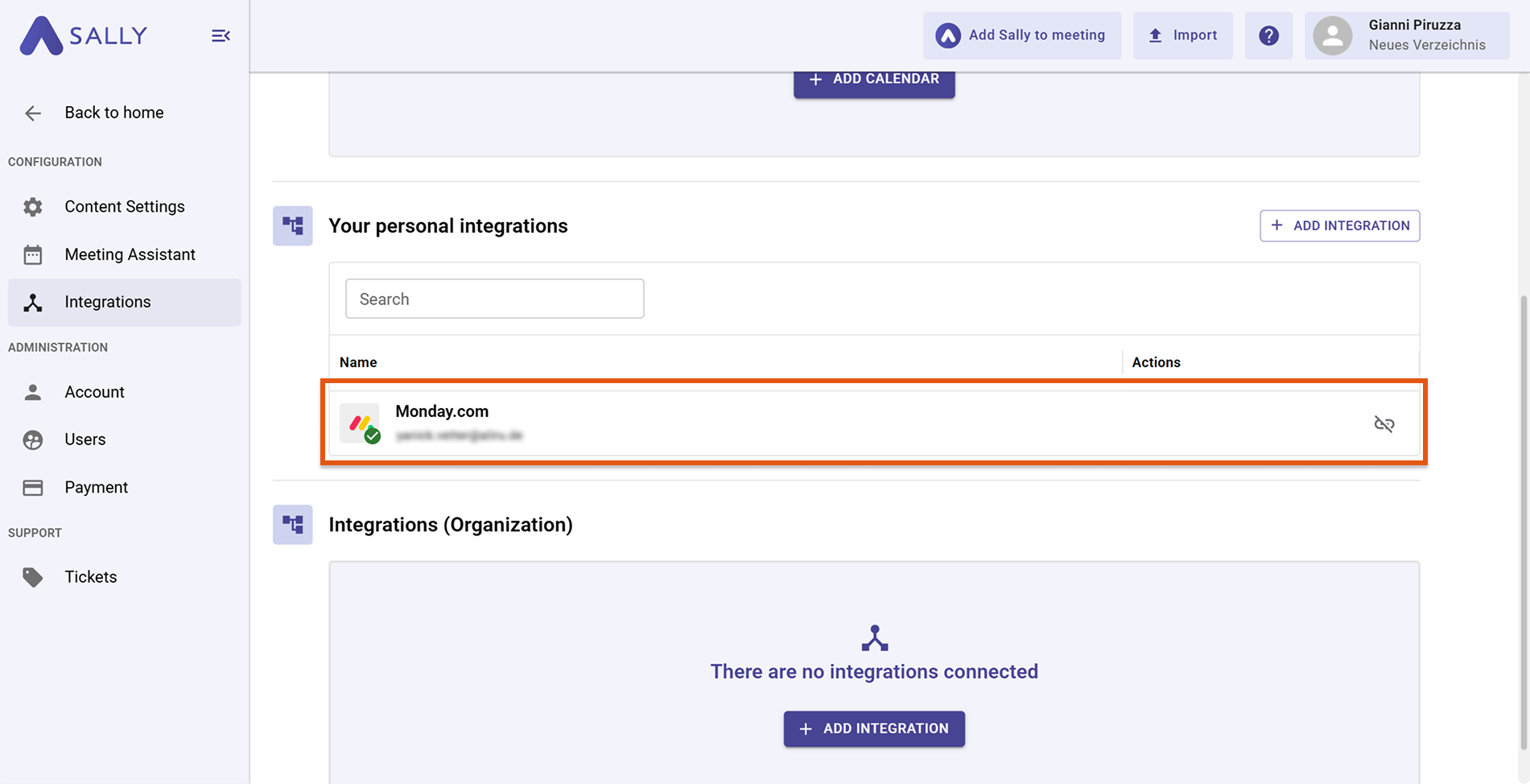 After a successful connection, Monday.com will appear under "Your personal integrations".