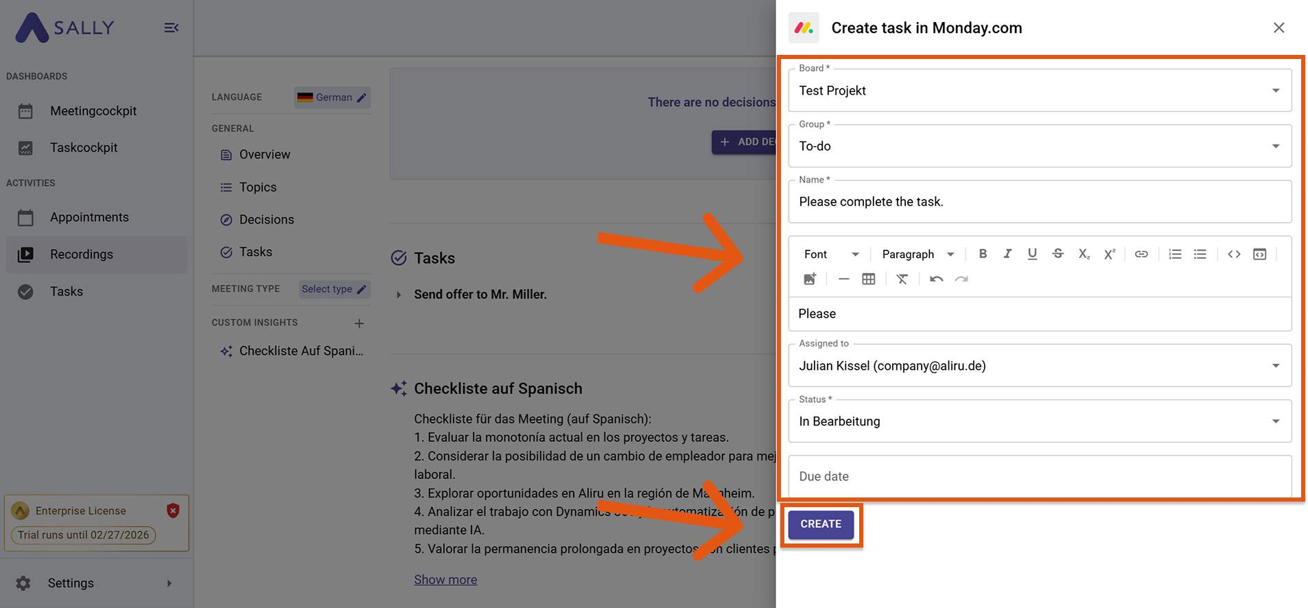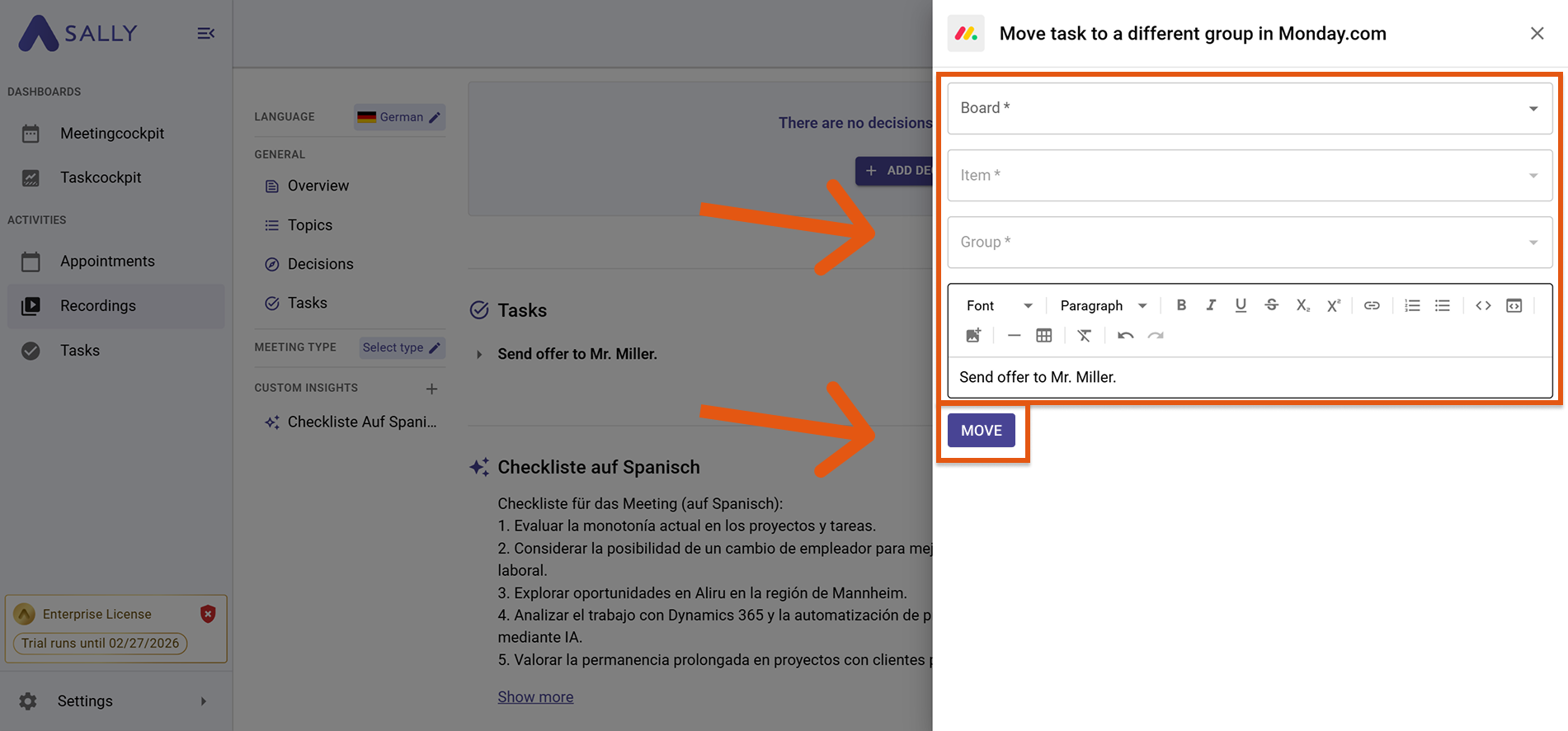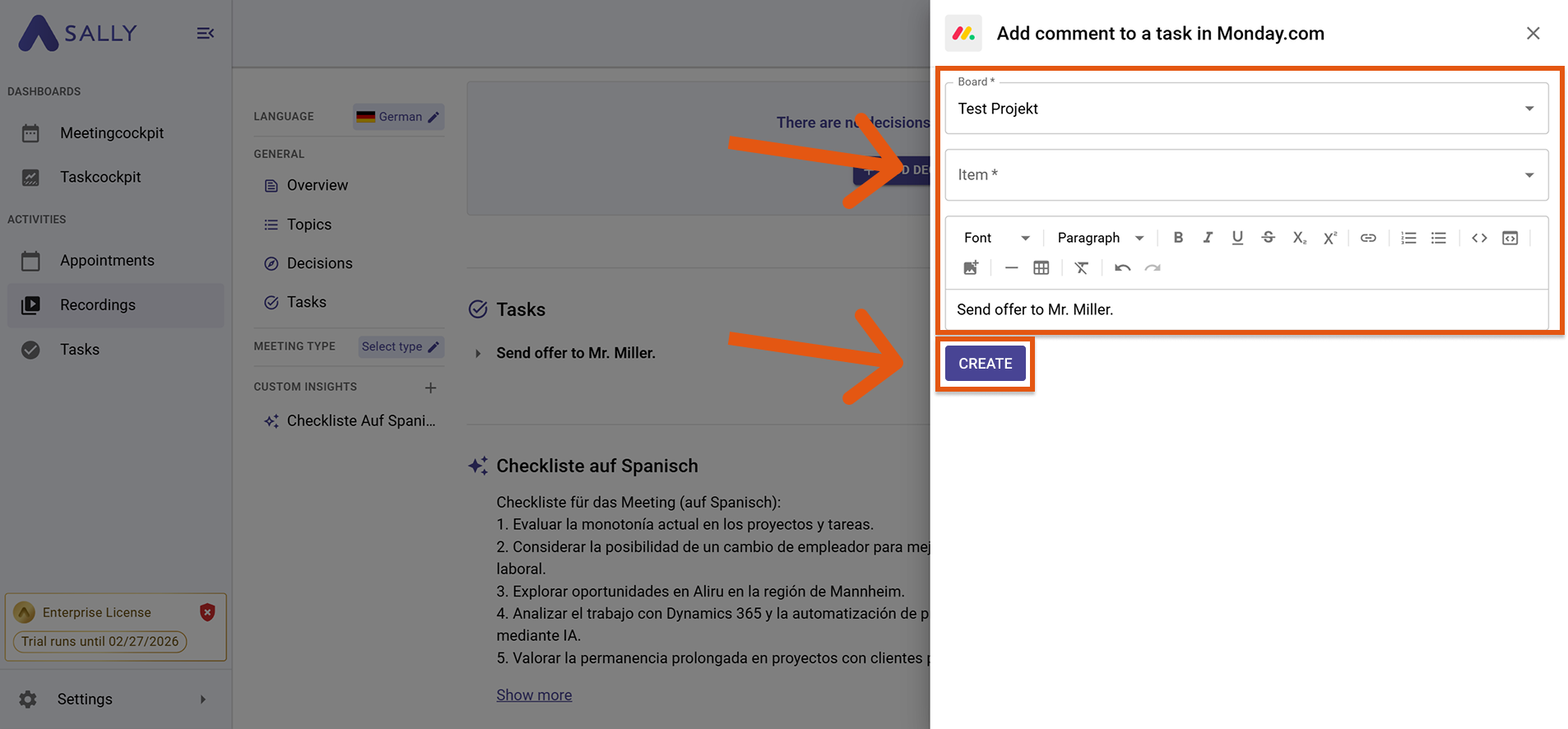 Once Monday.com is connected, you can send meeting content directly from Sally to Monday – no copy & paste required.
