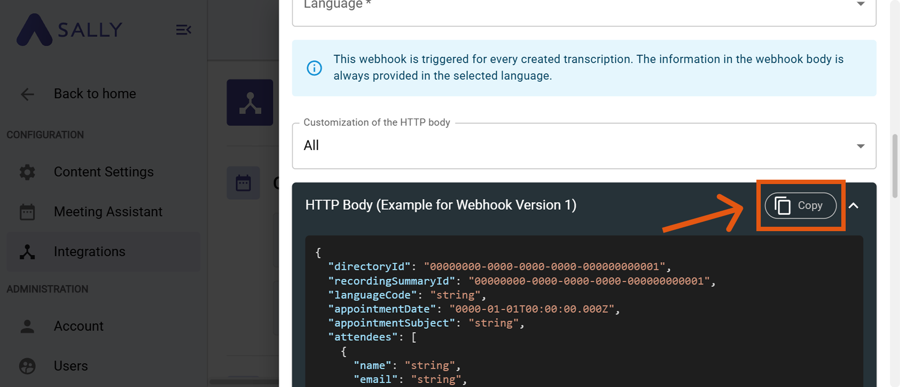 | HTTP Body Customization | Defines which content Sally includes in the webhook body. Each category can be enabled or disabled individually. The following elements are available: • Tasks – All detected tasks including assignees and due dates. • Custom Insights – Results from custom insights (e.g., checklists or custom fields). • Objections – Detected objections from the conversation. • Decisions – All decisions made during the meeting. • Key Points – Important core topics or main statements of the meeting. • Meeting-type-specific elements – Content generated from the selected meeting type (e.g., question catalog). • Transcription – Full transcript sections including speakers, timecodes, and emphasis. • Summary – The generated main summary as well as HTML variants. By enabling/disabling these fields, you can precisely control how detailed the webhook body should be. |