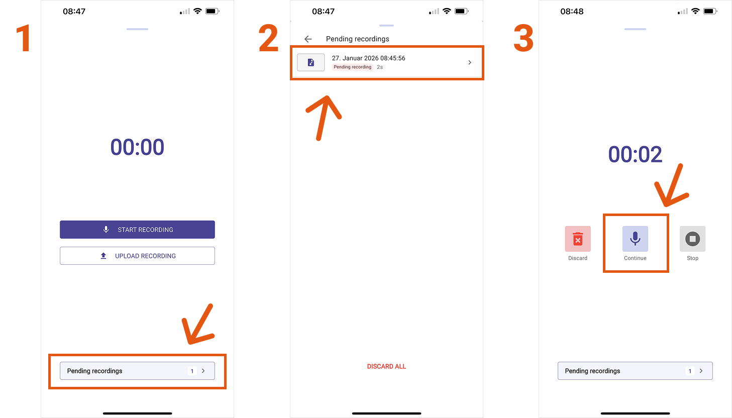 If a recording is stopped unintentionally, it is not lost. You can easily access and resume it directly within the app.
