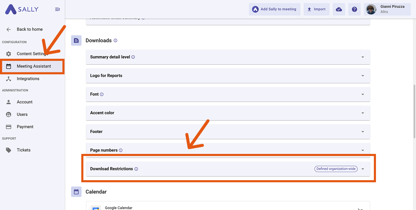 Administrators can restrict which file types users are allowed to download from Sally. This helps protect sensitive meeting data and ensures compliance with your organization's privacy policies.