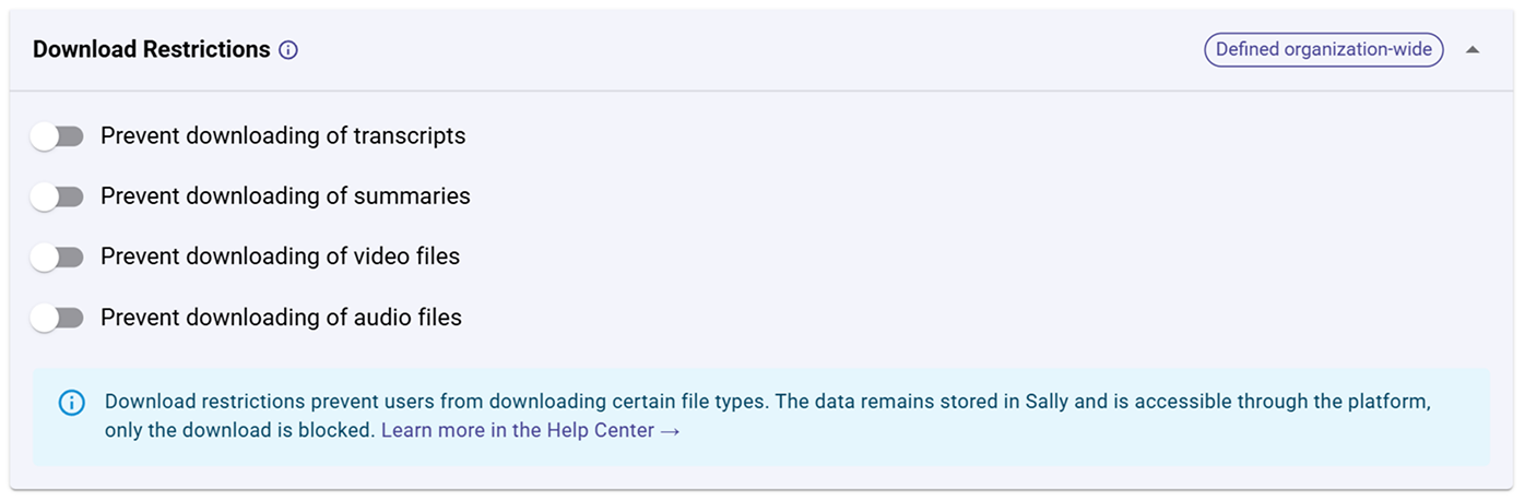 By enabling download restrictions, you can prevent users from exporting transcripts, summaries, video recordings, or audio recordings — while still allowing them to view these items within Sally.