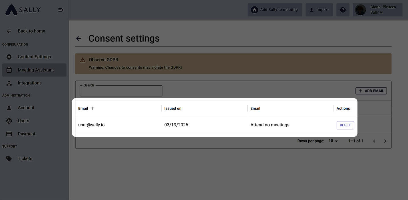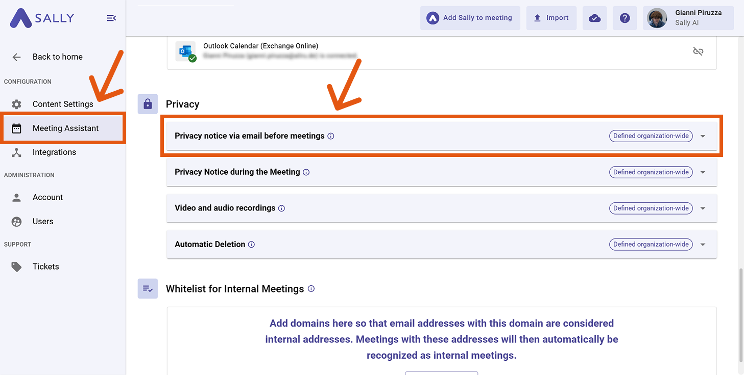 Sally can automatically inform meeting participants by email before a meeting starts if a recording is planned. This setting allows admins to define whether an email is sent and how consent is handled.