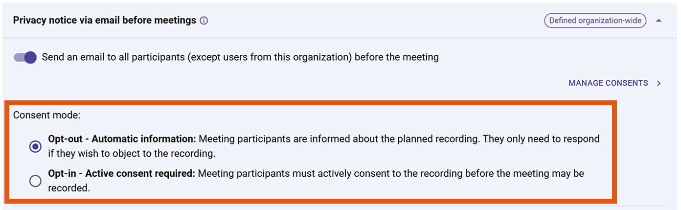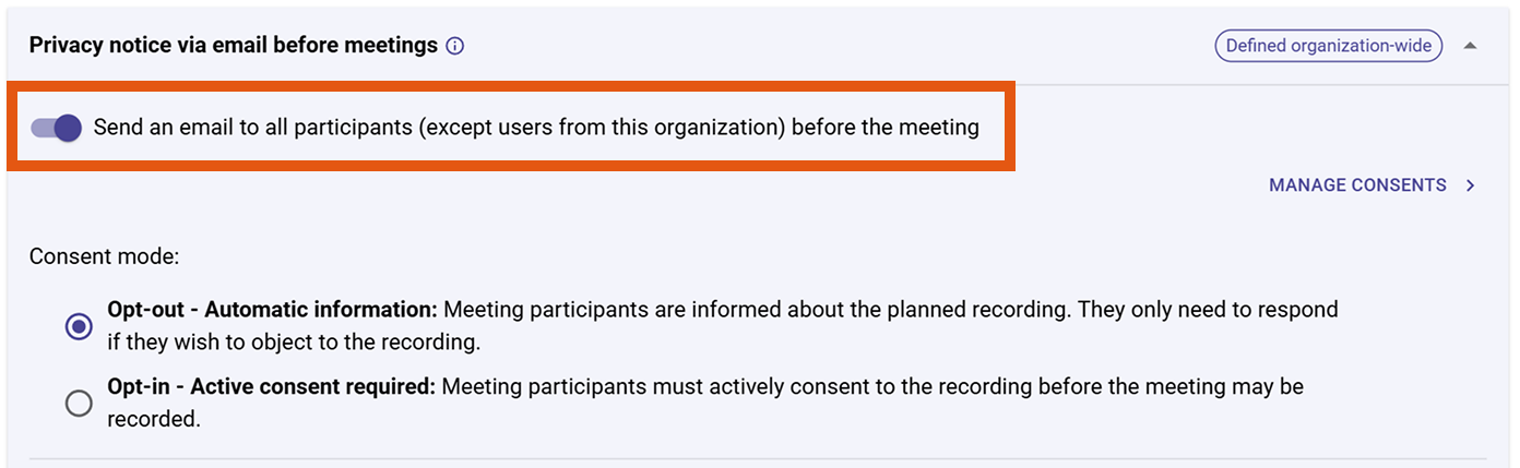 - In the section "Privacy notice via email before meetings", click on "Manage consents".