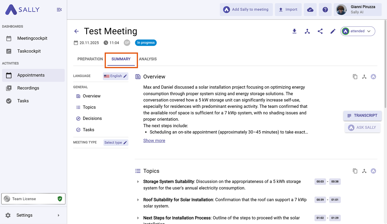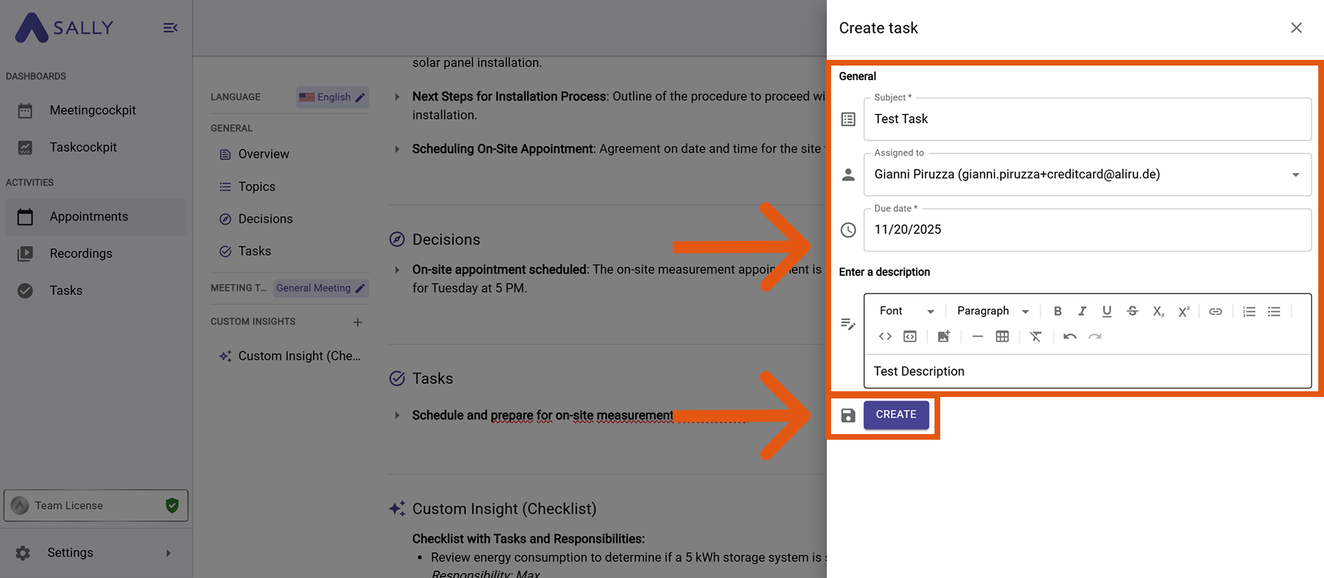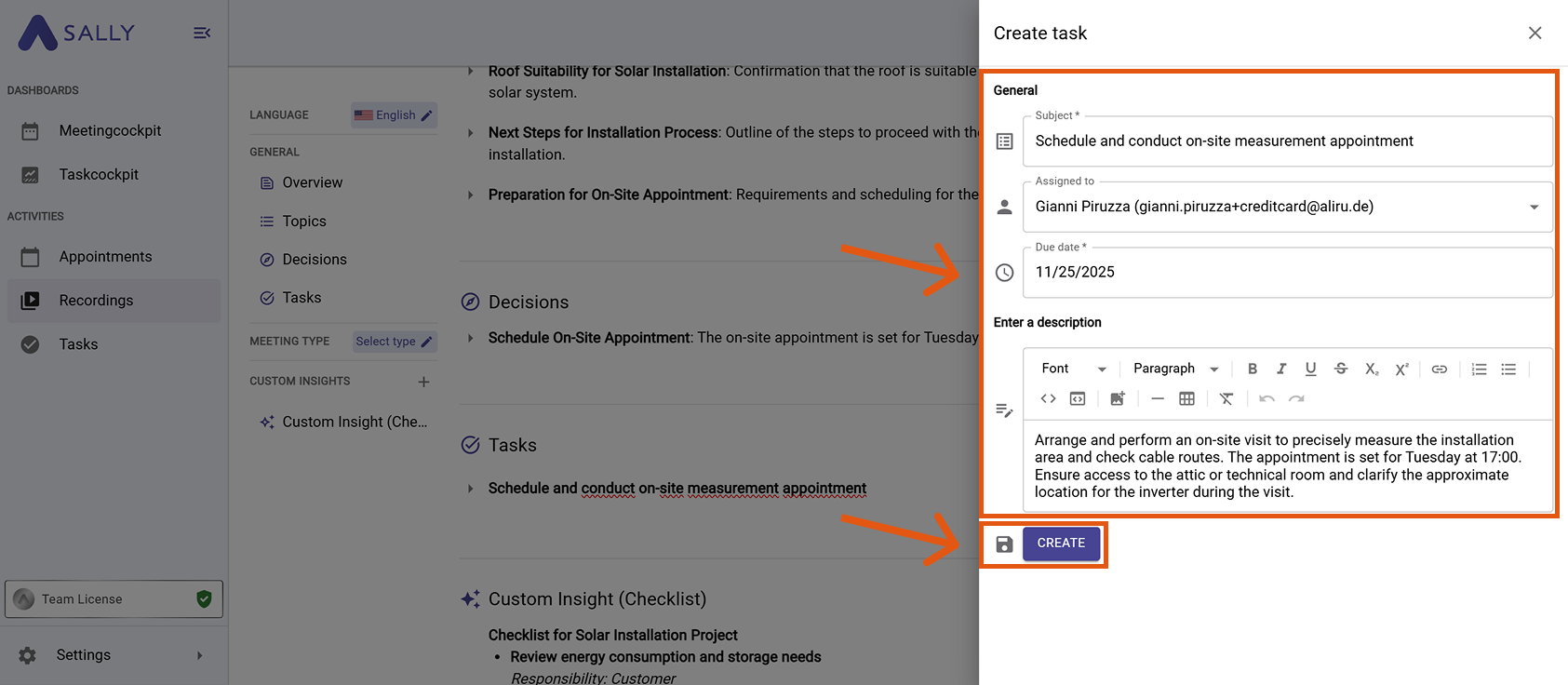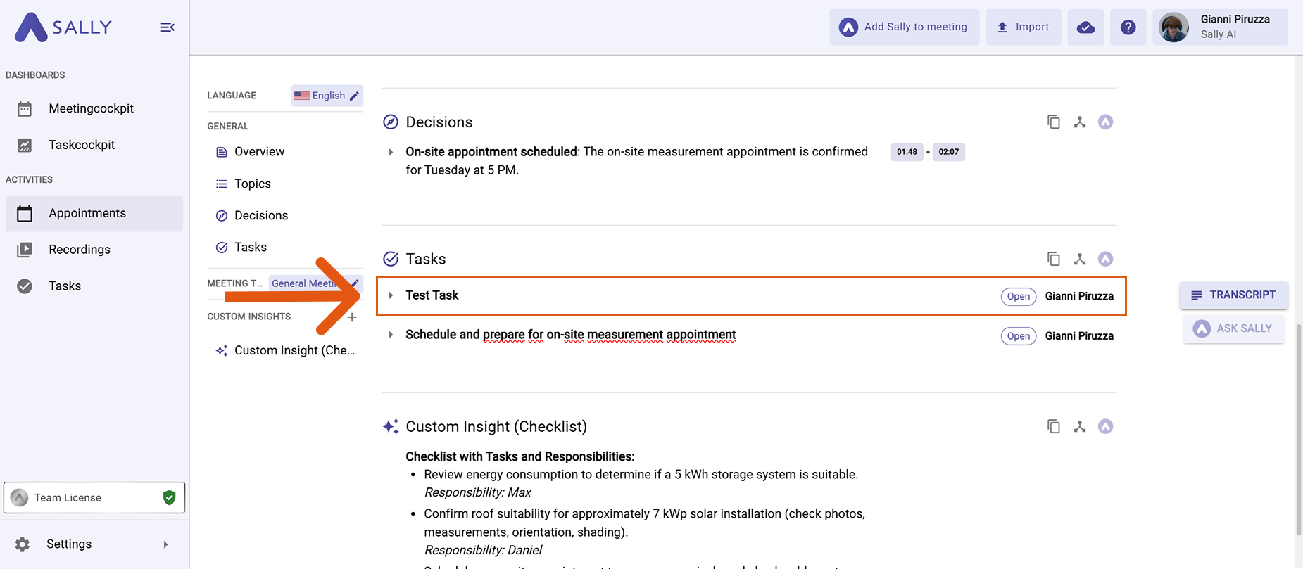 With these steps, you can create new tasks, add suggested tasks from your meeting summaries, and sync them with your tools — all directly inside Sally, without leaving the meeting view.