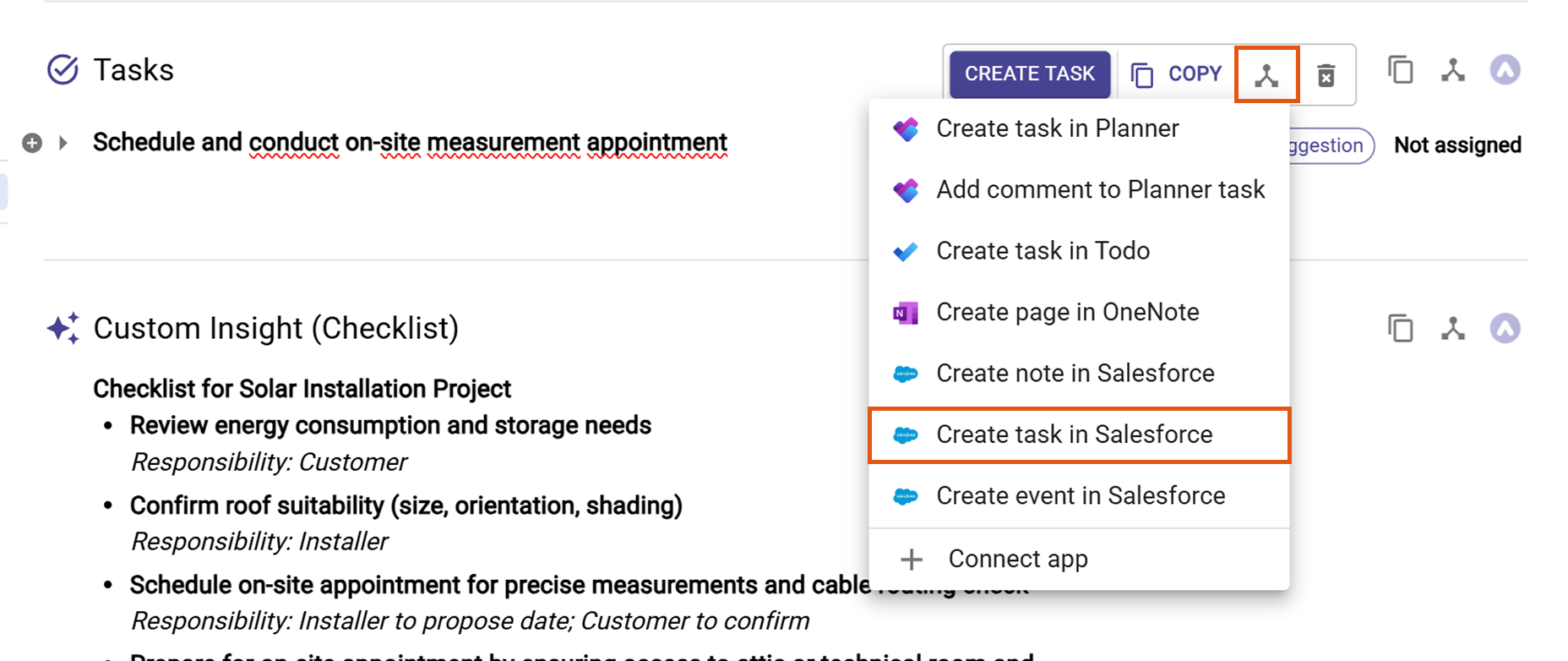 You can send any task directly to your connected tools — such as Salesforce, Microsoft Teams, Pipedrive, and many more.