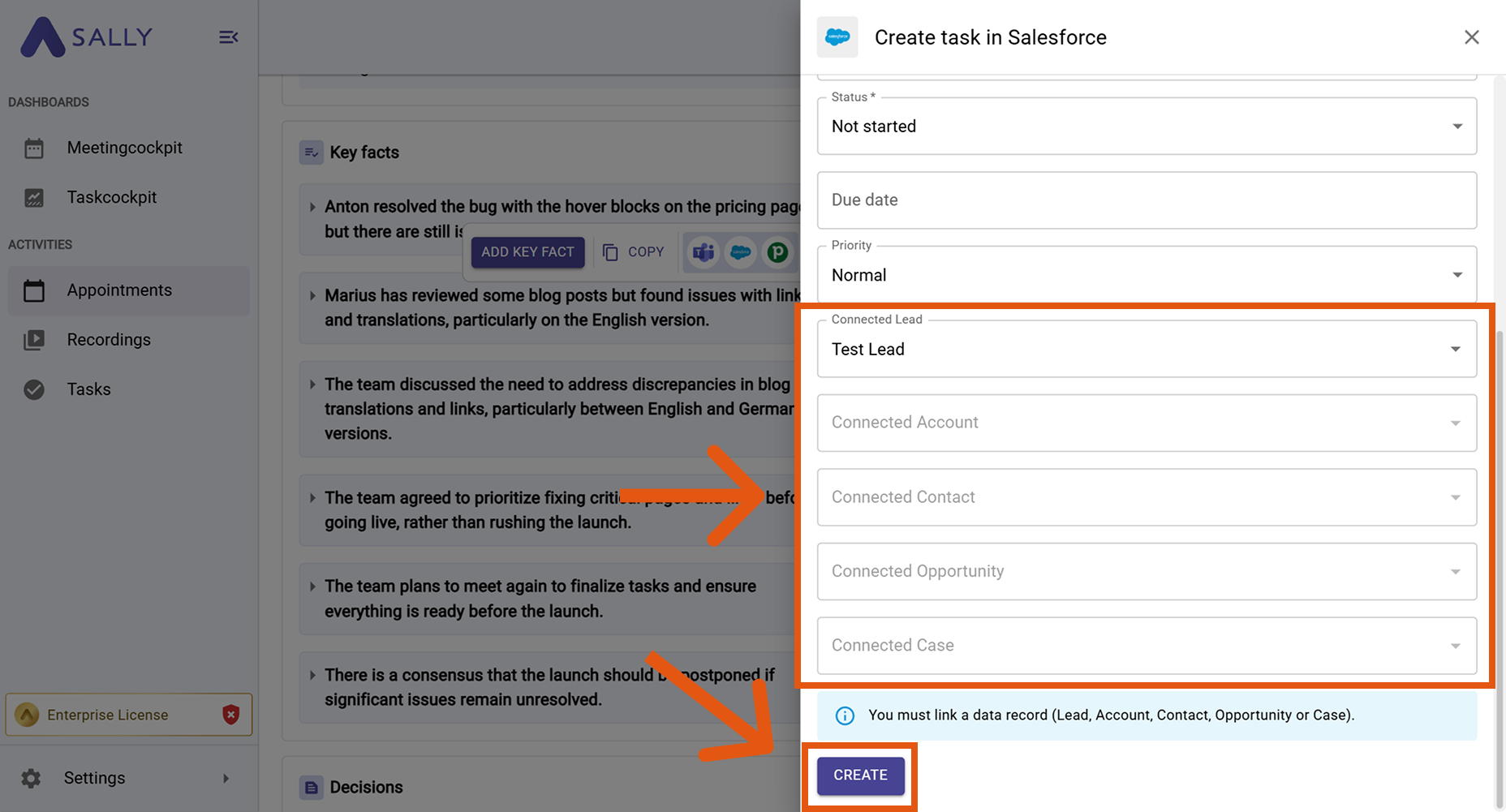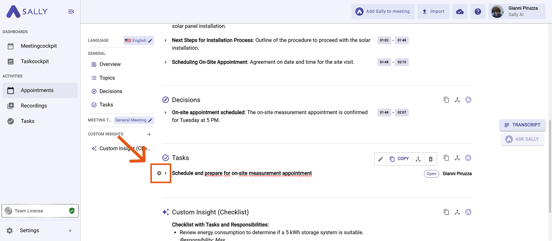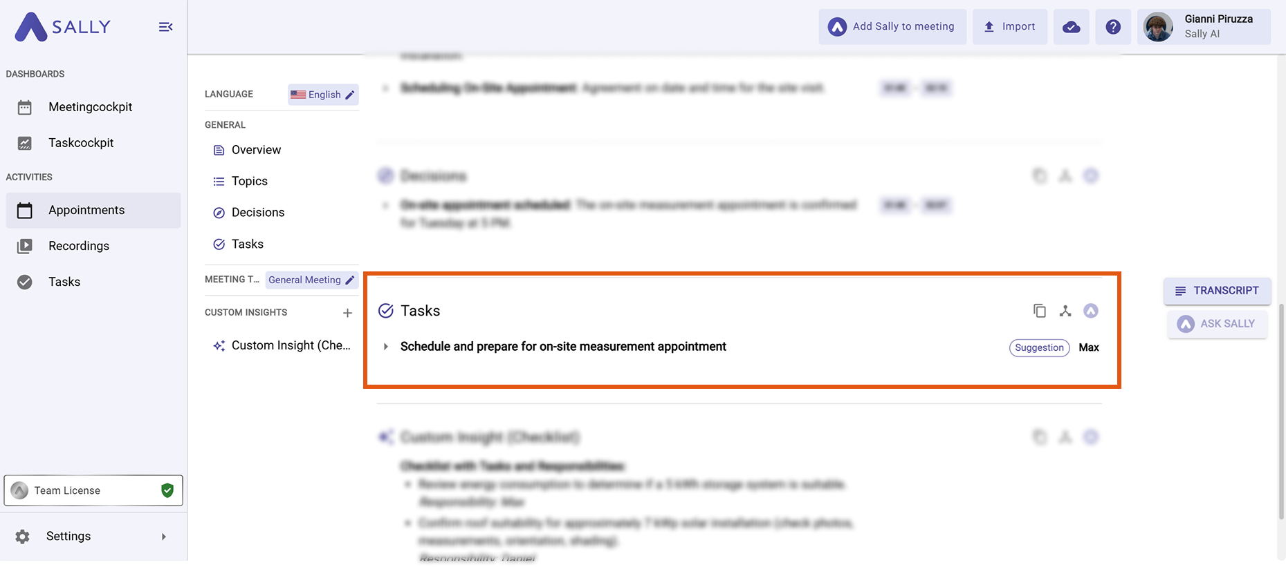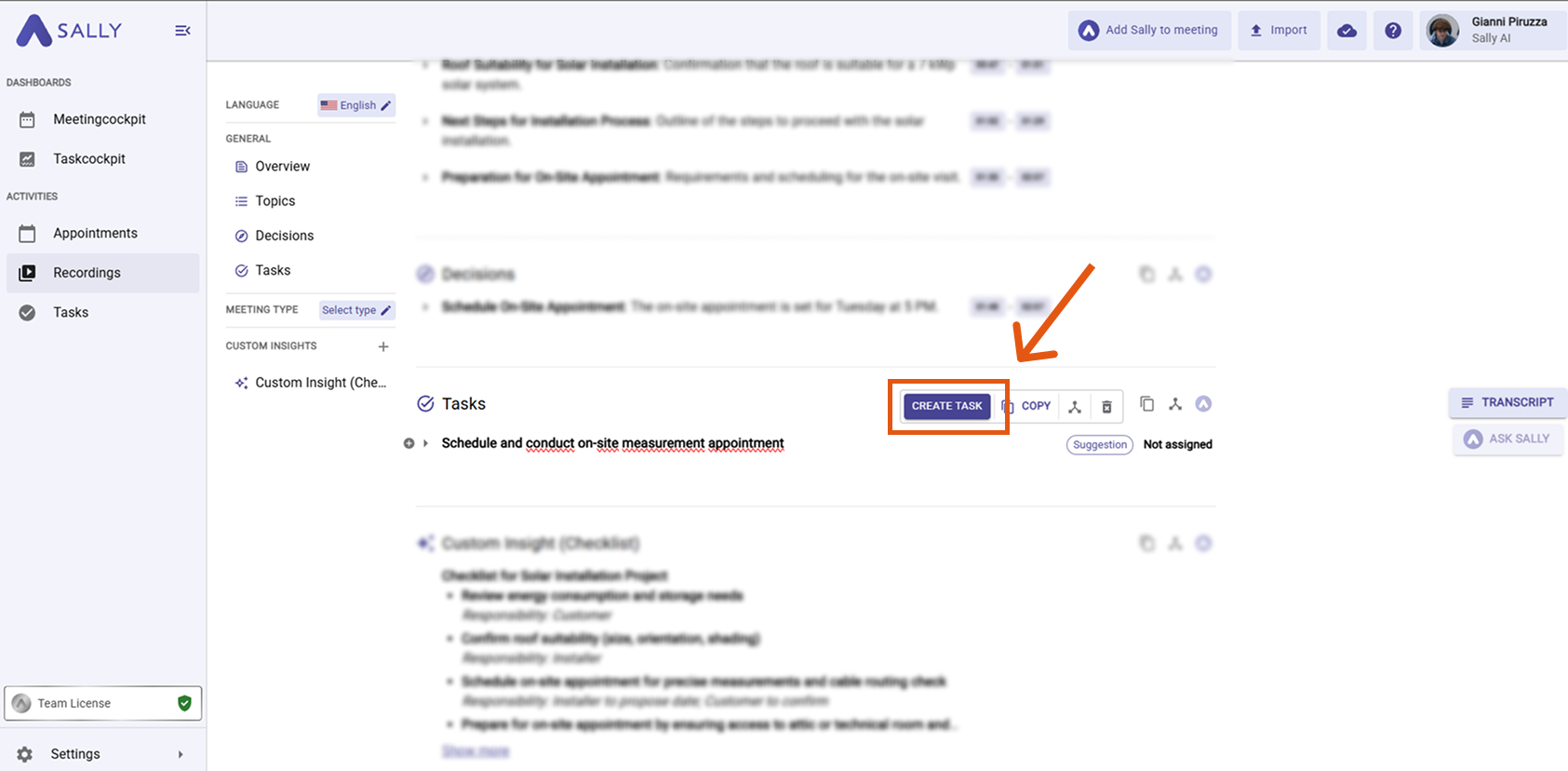 Sally automatically identifies potential tasks from your meetings and shows them in the summary as task suggestions. You can then decide whether to: