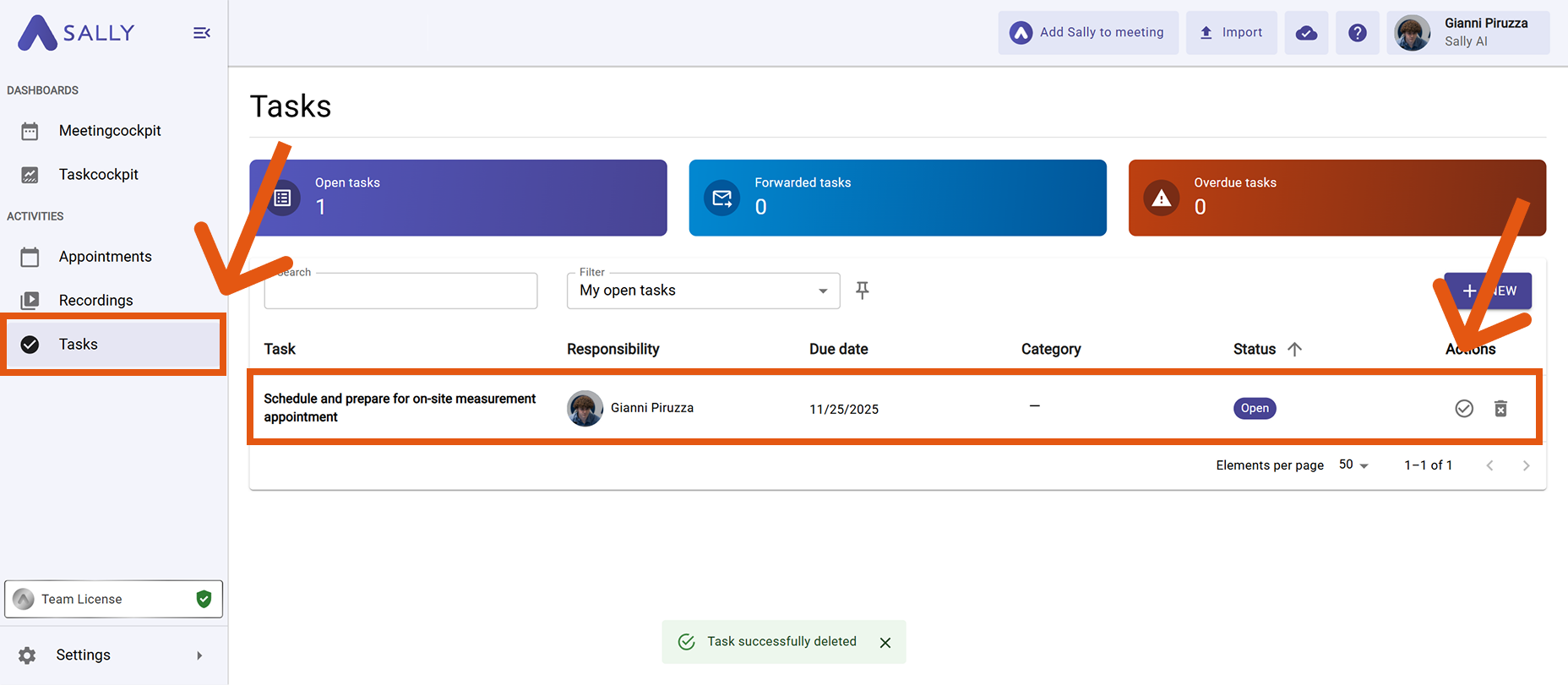 Here you’ll find all tasks Sally recognized. From here, you can edit them, sync them, or add new tasks.