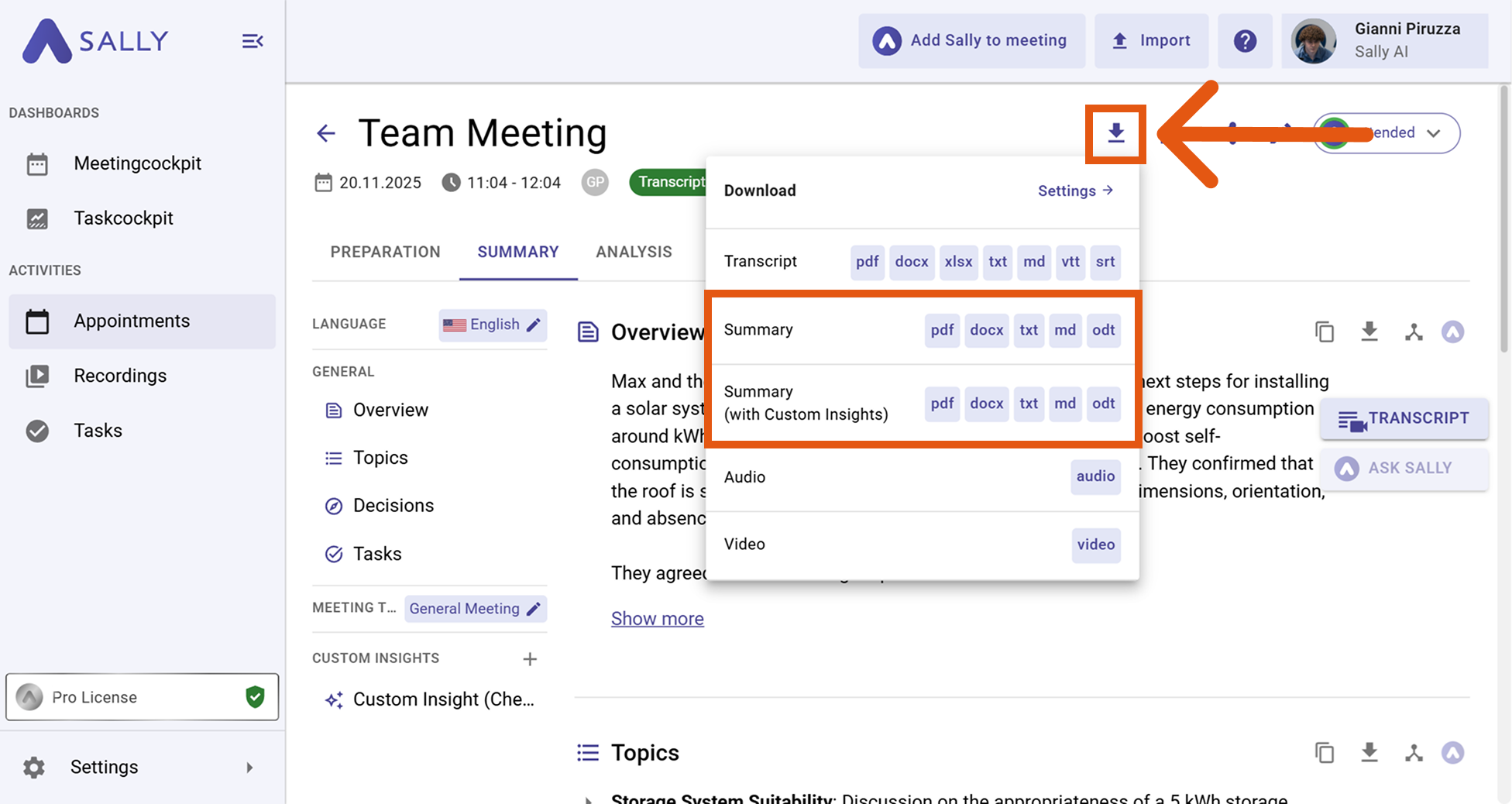If you want the downloads to match your company style, first set up your branding (logo, color, footer). After that, Sally automatically generates PDF/DOCX in your branding (TXT, MD, and ODT contain the raw data).