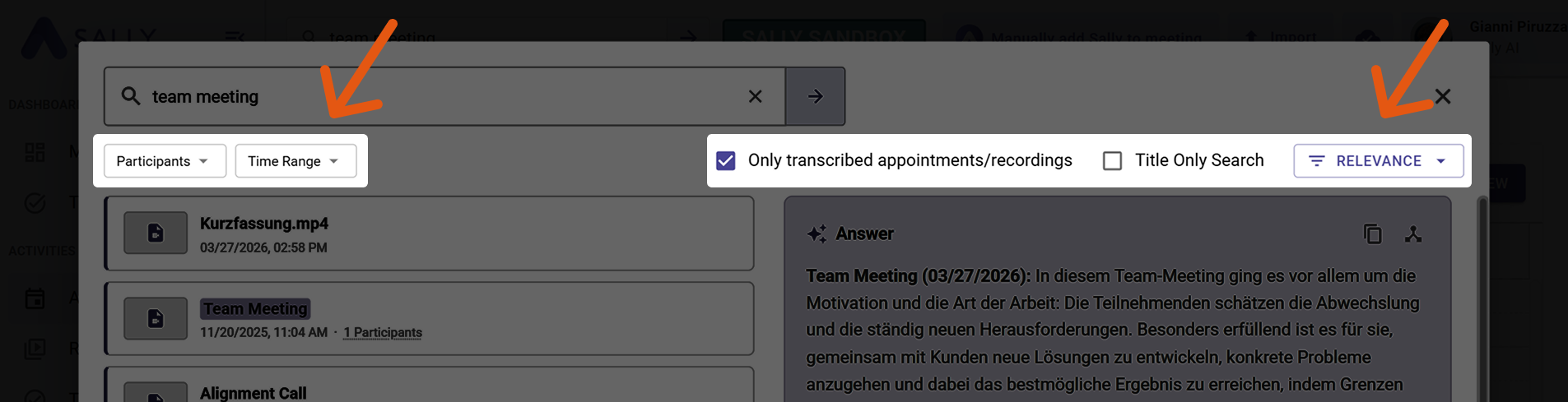 - Sally displays a list of matching meetings on the left side. On the right side, you immediately see an AI-generated answer that summarizes the key information across all matching meetings.