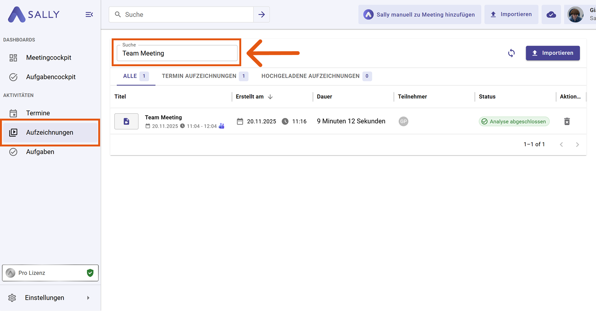 Enter the name of a meeting or recording in the search field. Sally filters your list directly by name and shows only the matching results.