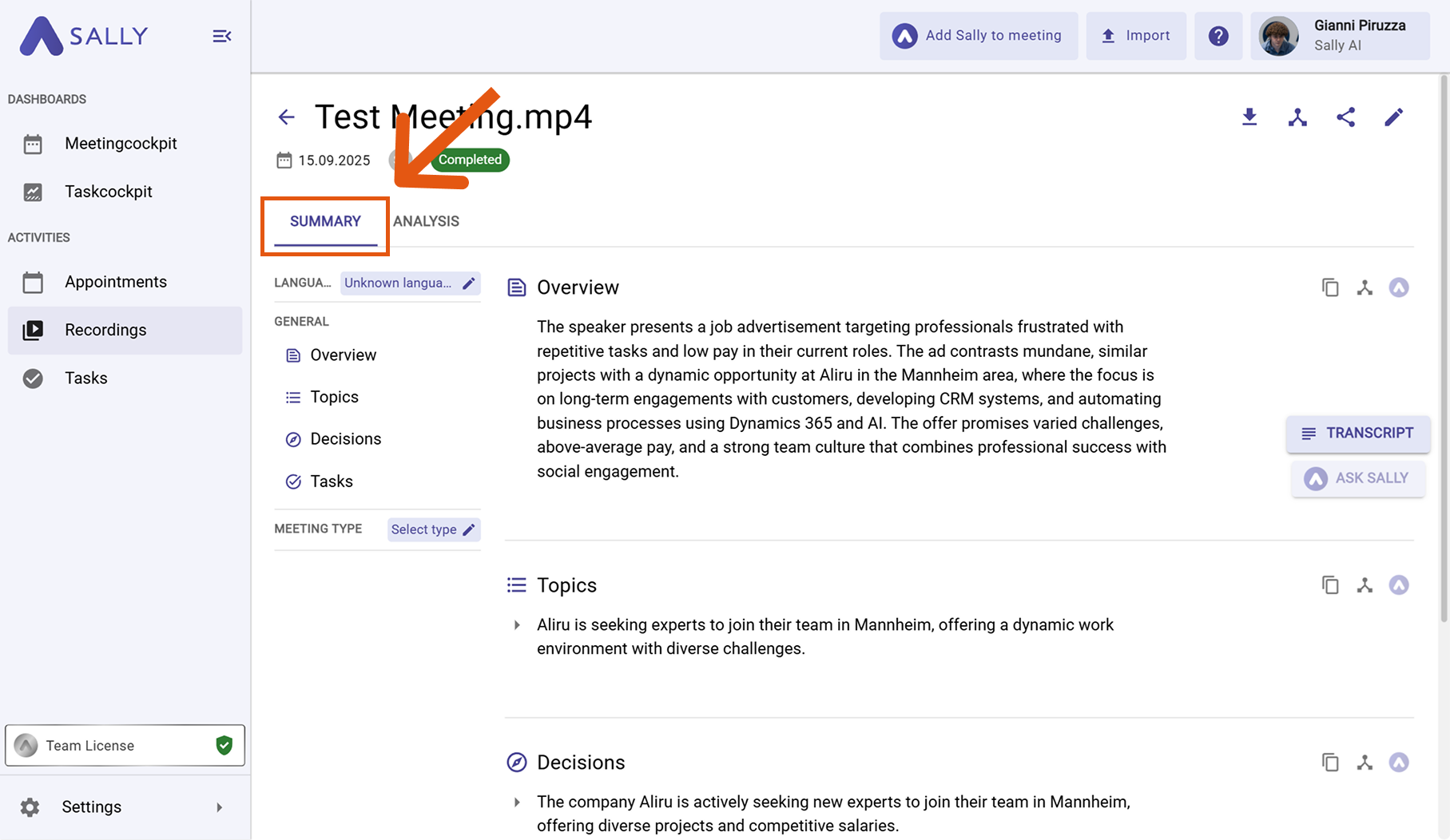 Sally automatically generates meeting summaries using advanced AI technologies. These summaries provide a structured overview of the most important information from a meeting, helping teams quickly identify key points, tasks, decisions, and next steps.