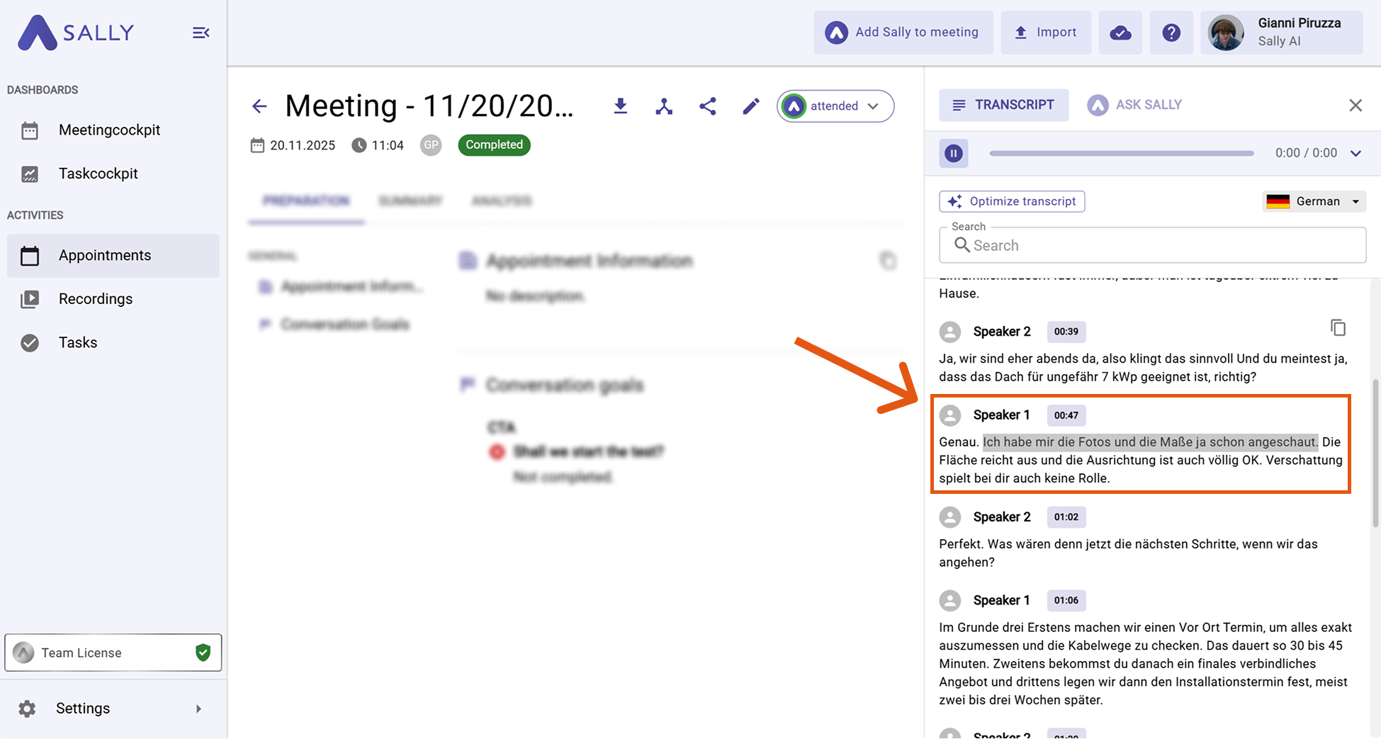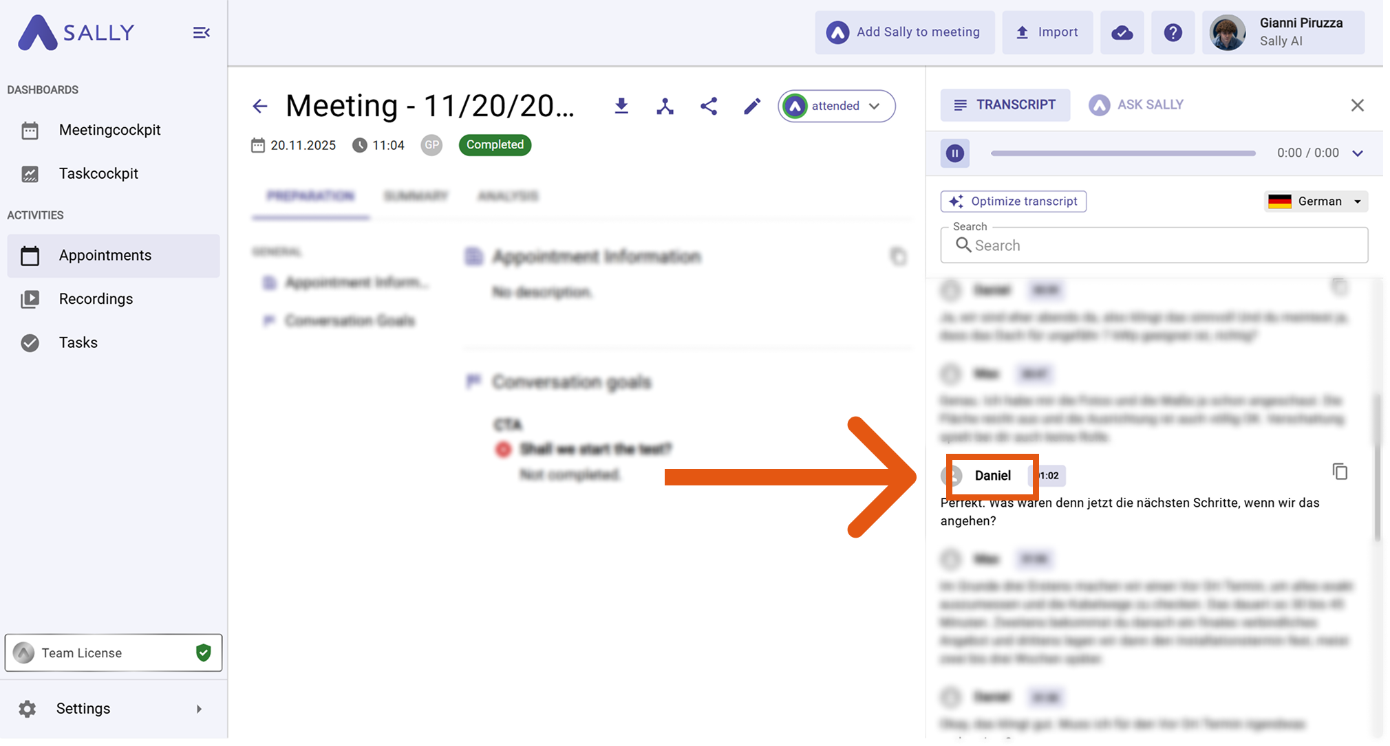 If a sentence has been assigned to the wrong speaker due to poor audio quality or overlapping speech, you can manually correct the speaker name.