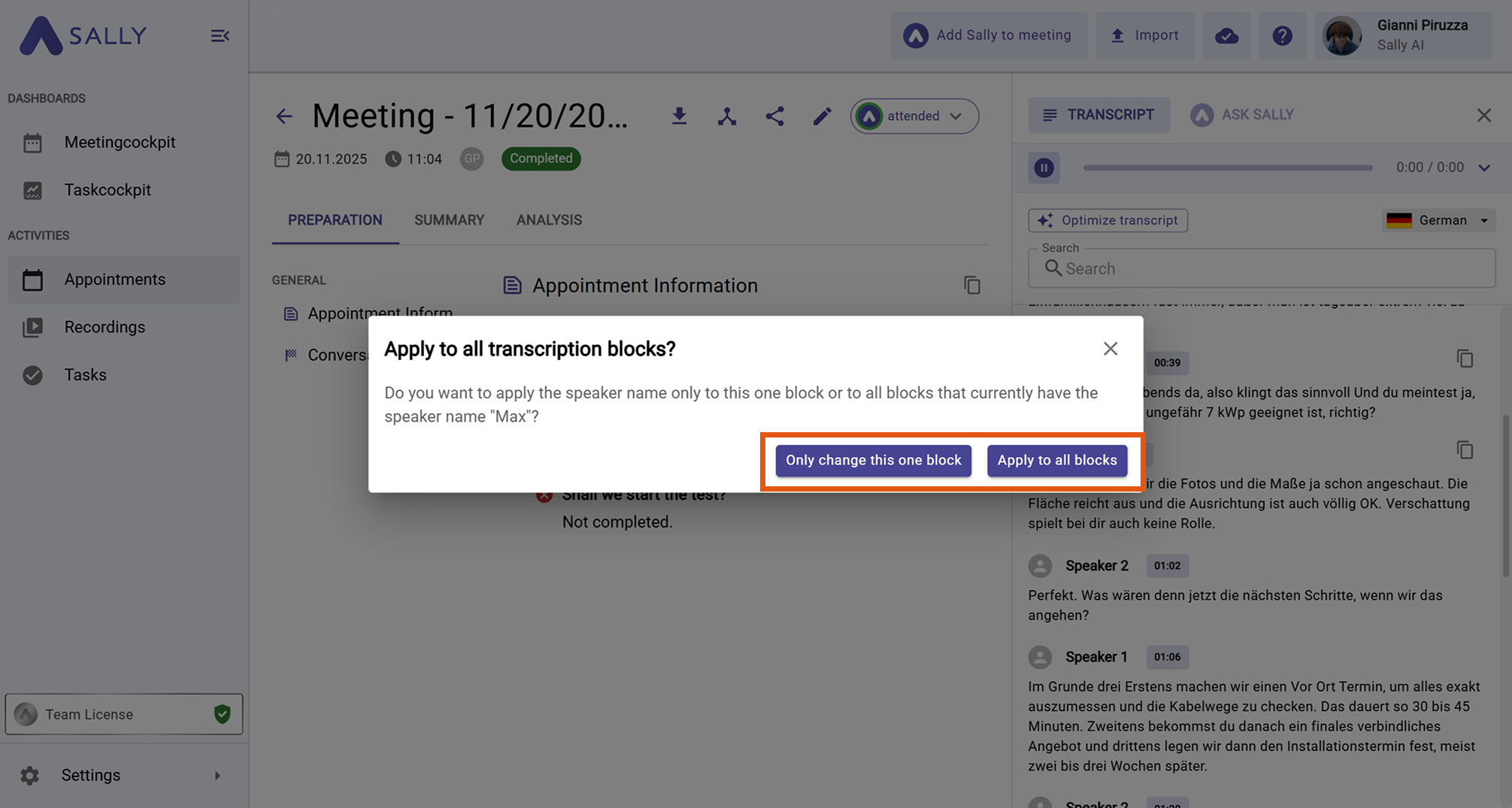 - Apply to all blocks – updates the speaker name across the entire transcript.