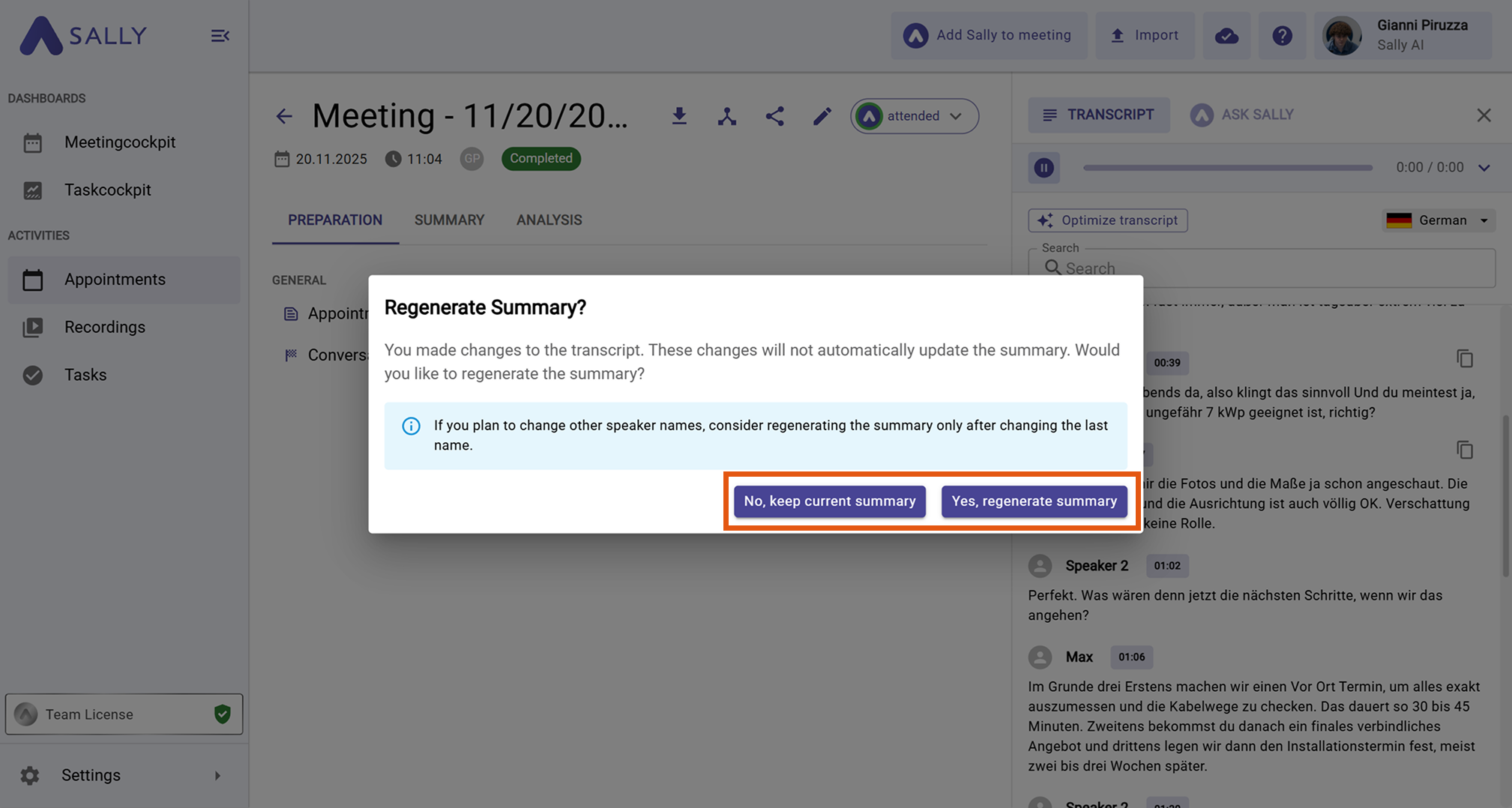 - Choose whether the summary should be regenerated.