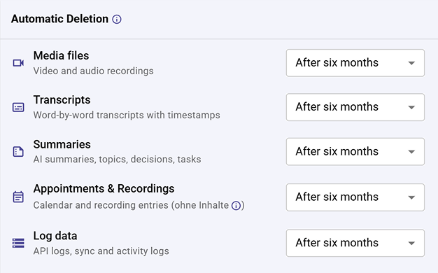 Set individual retention periods for transcripts, audio & video, summaries, appointments, and log data. Each one on its own schedule.